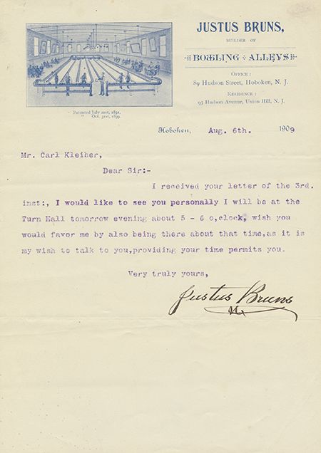 Terrific very early bowling letterhead, 1p. 8vo., New York, Aug. 6, 1909 in which bowling alley builder Justus Bruns arranges a meeting with one Carl Kleiber. The letterhead depicts a bowling alley with six lanes and manual pin-setters in the background. Fine.