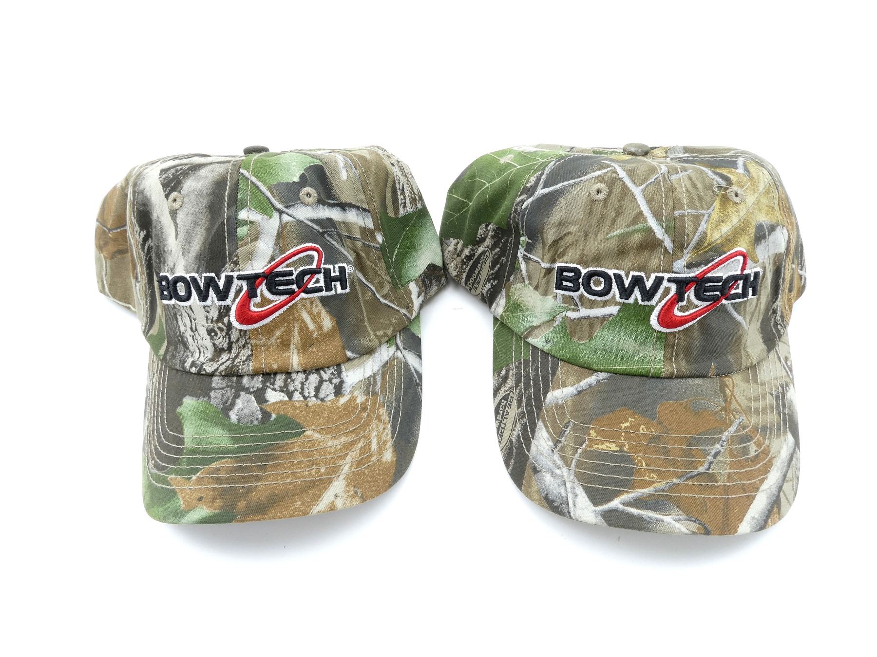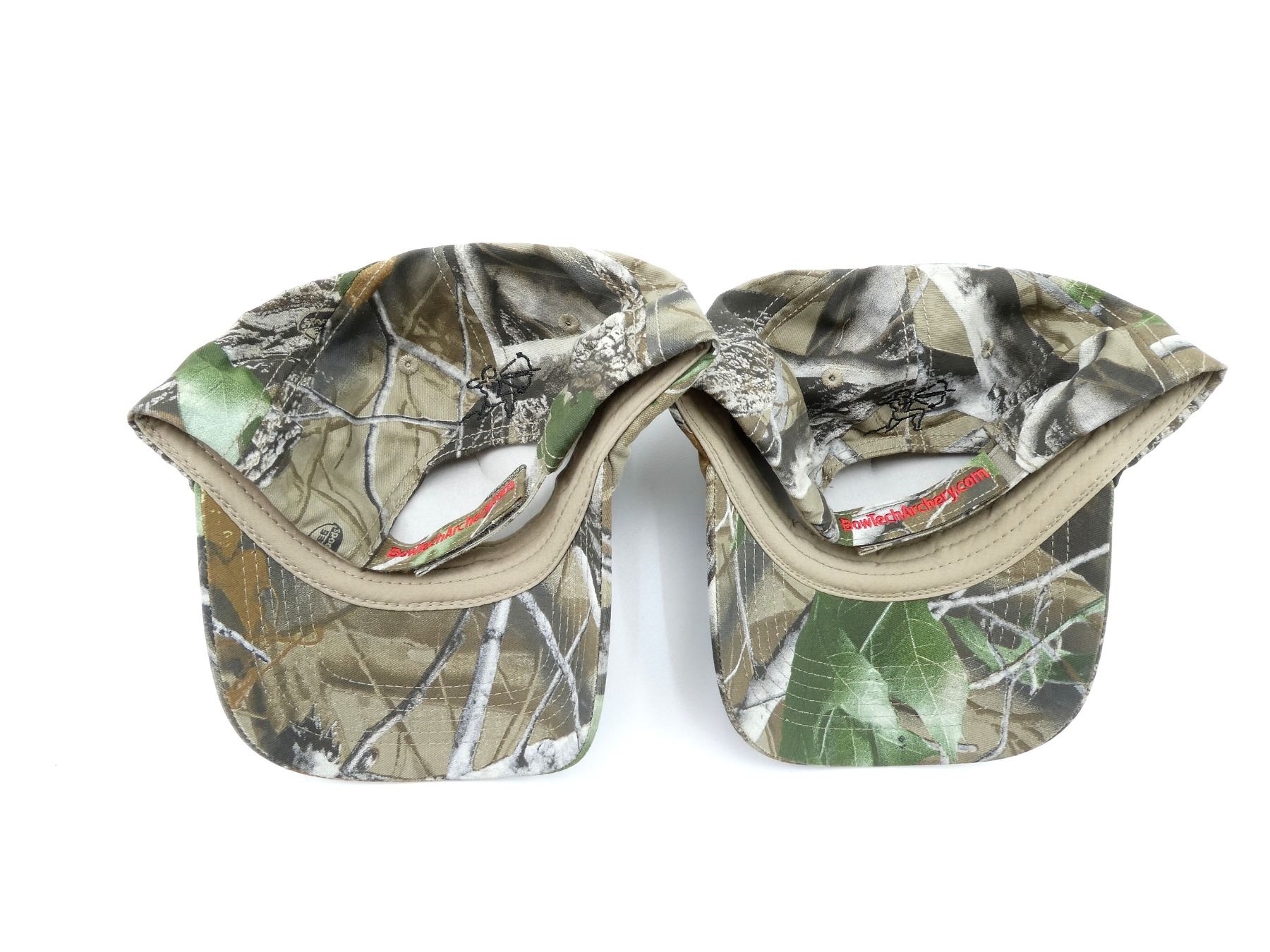 LOT INCLUDES; (2) REALTREE CAMOUFLAGE BALL CAPS, ONE SIZE VELCRO CLOSURE, MARKED: "BOWTECH", APPEARS NEW OLD STOCK. SEE PHOTOS.