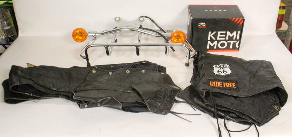 BOX ASSORT MOTORCYCLE PARTS & VESTS