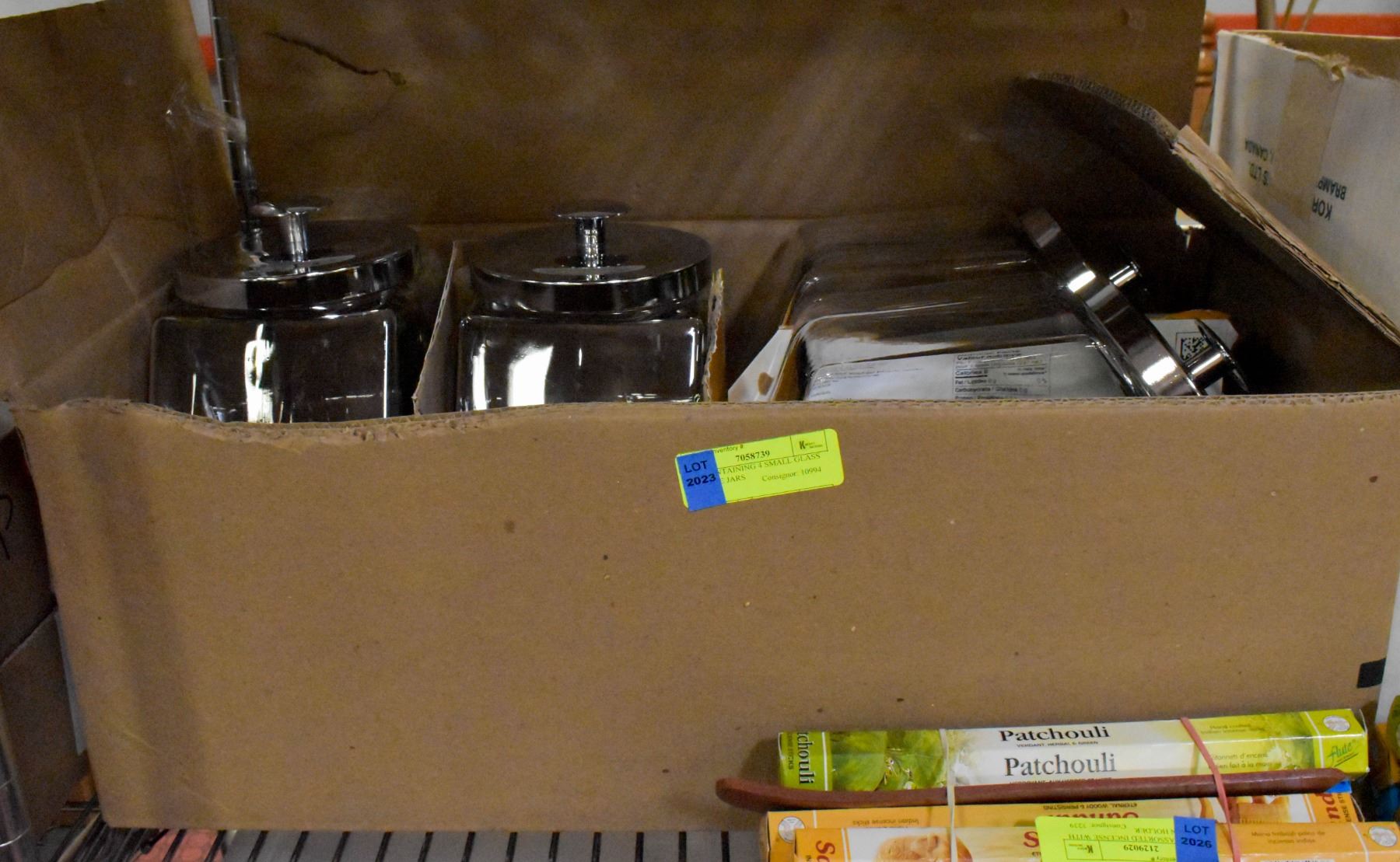 BOX CONTAINING 4 SMALL GLASS STORAGE JARS
