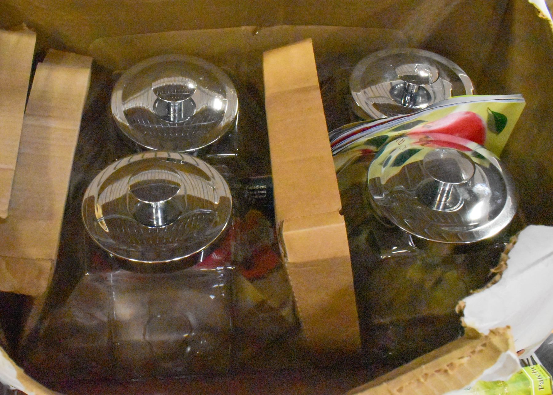 BOX CONTAINING 4 SMALL GLASS STORAGE JARS
