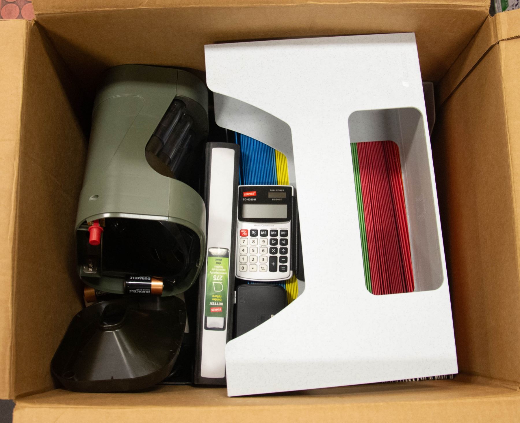 4 EA. X PLASTIC HANGING FILE FOLDER HOLDERS WITH FILE FOLDERS 1 EA. X ULTRA SORTER – BATTERY OPERATED COIN SORTER 1 EA. X 110V ELECTRONIC DESK TOP CALCULATOR WITH PAPER ROLL 1 EA. X KENSINGTON NOTE BOOK USB CALCULATOR 2 EA. X HANDHELD CALCULATORS “ALL ITEMS IN WORKING CONDITION”