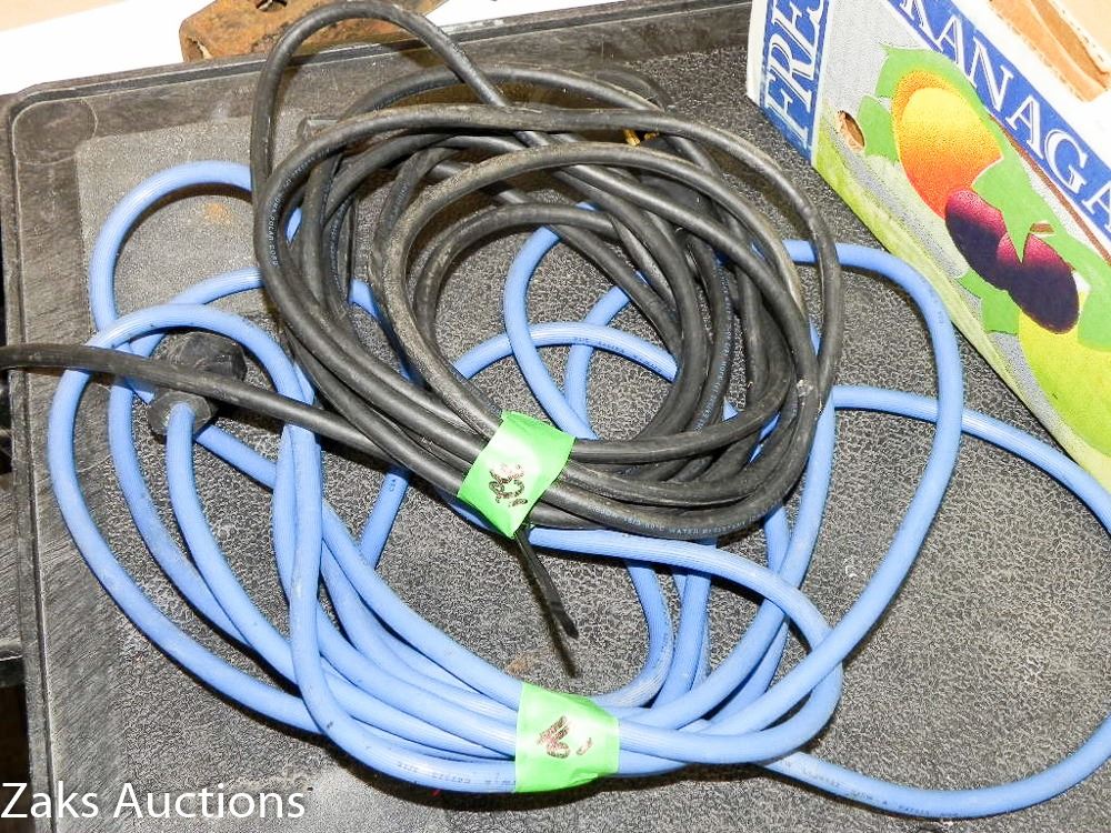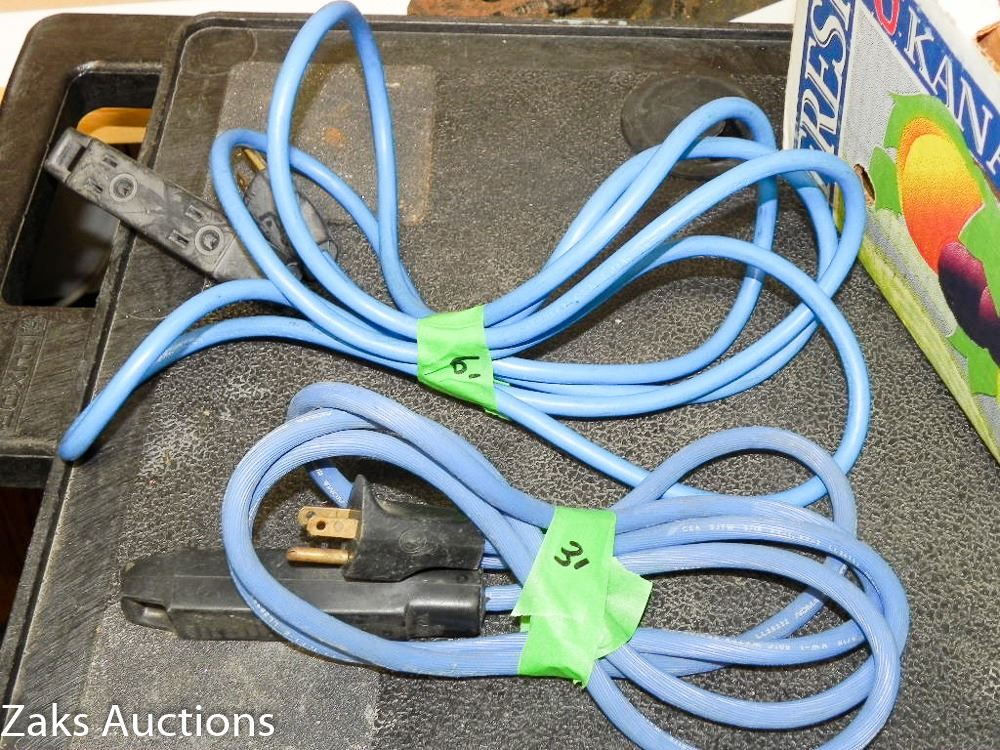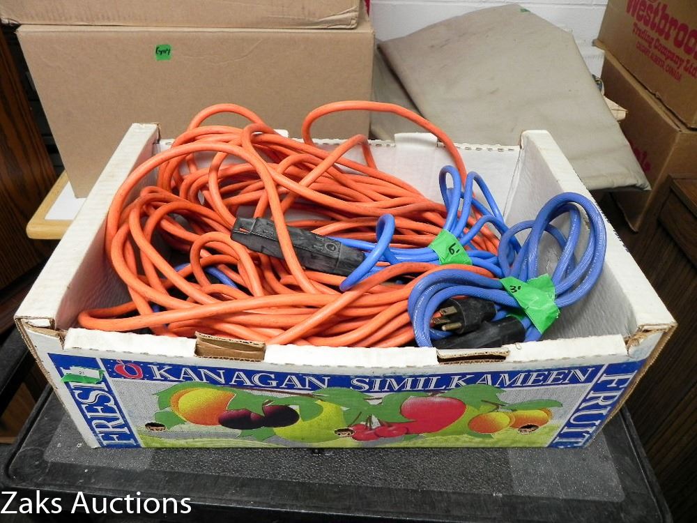 BOX FULL OF 5 EXTENSION CORDS VARIOUS LENGTHS, MOSTLY OUTDOOR AND WATERPROOF CORDS.