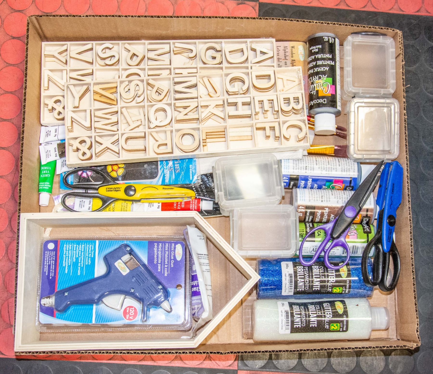GLUE GUN, 10 ACRYLIC PAINTS, 2 PACKS OF WOODEN ALPHABET LETTERS, PAINT BRUSHES, 4 PLASTIC STORAGE CONTAINERS WITH LIDS, ETC.