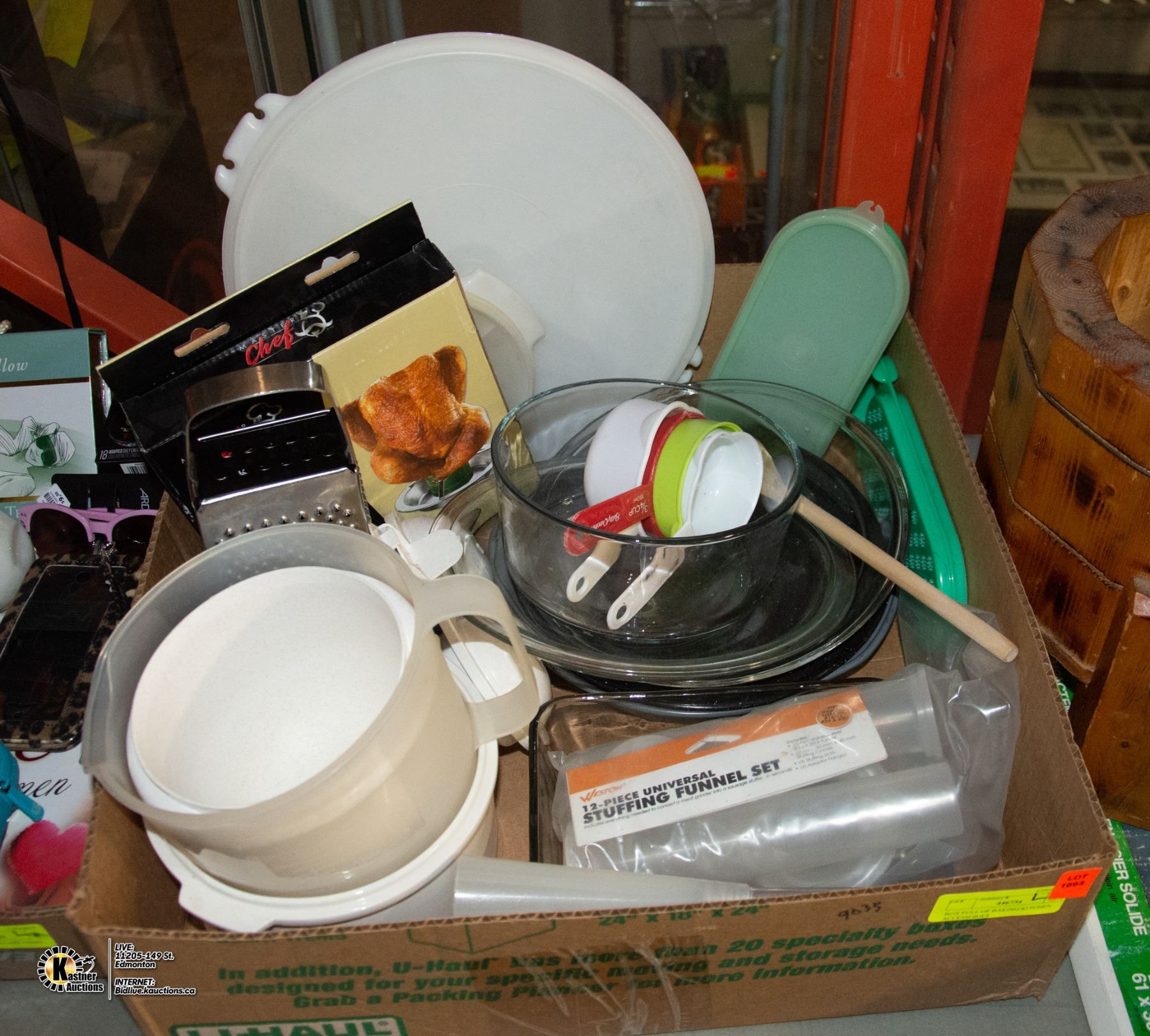 INCL. PYREX BAKEWARE, TUPPERWARE, NEW MASTERCHEF CHICKEN ROASTER, WESTON UNIVERSAL 12-PIECE STUFFING FUNNEL SET, ETC.