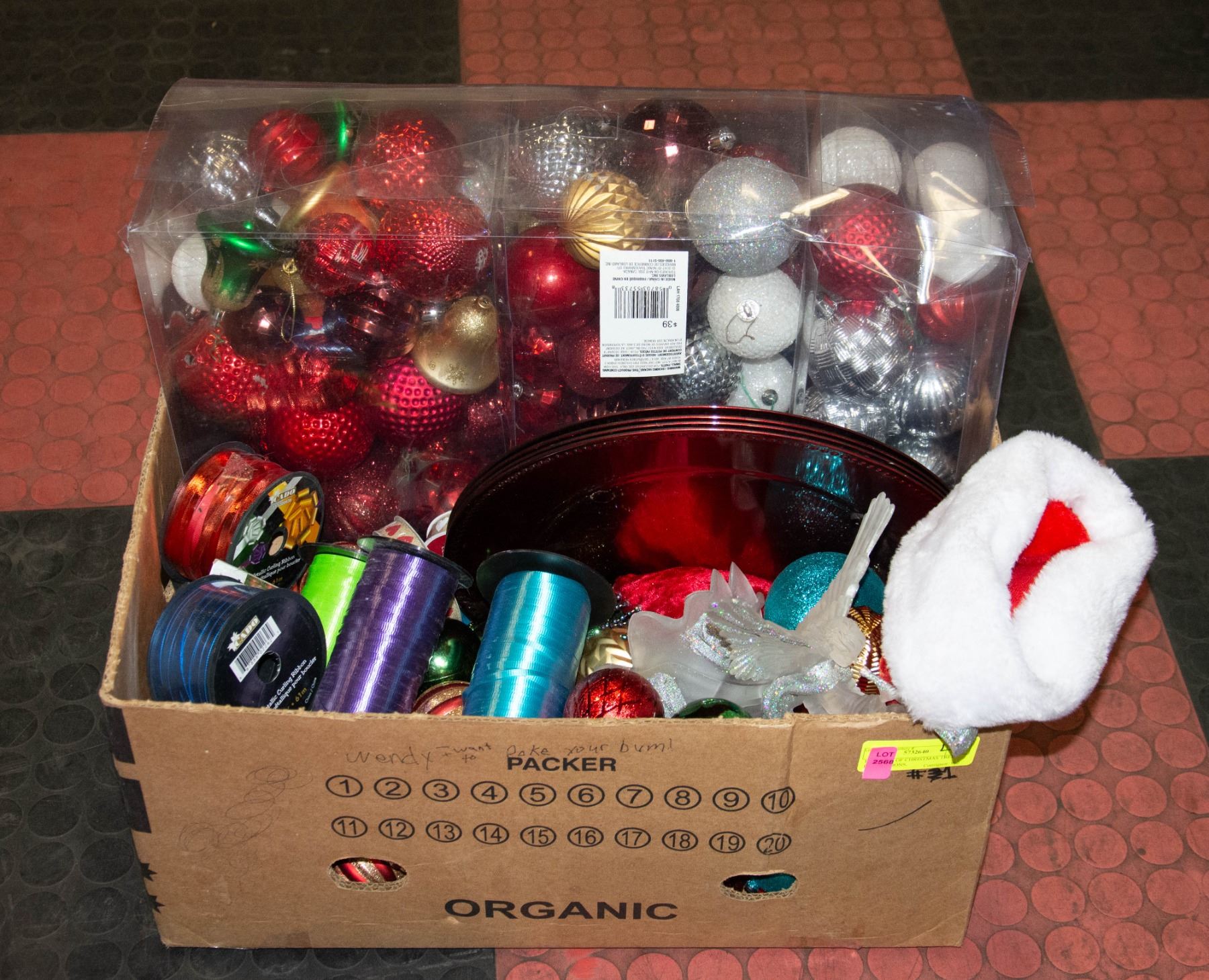BOX FULL OF CHRISTMAS TREE DECORATIONS,