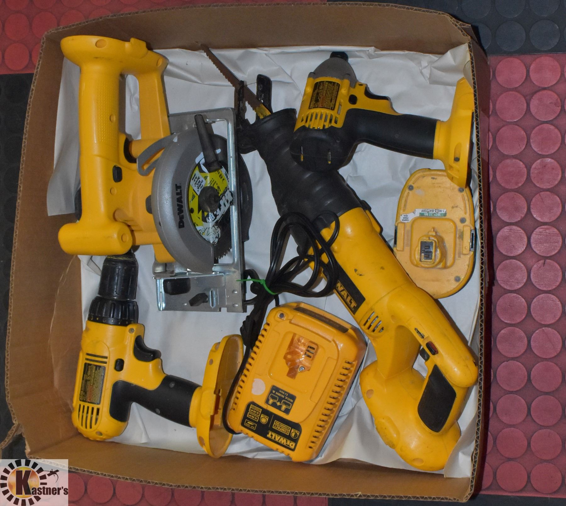 CHARGER AND WORKING BATTERY INCL. RECIPROCATING SAW DW938, 5 3/8 CIRCULAR TRIM SAW, HEAVY DUTY 1/4 INCH IMPACT DRIVER, 1/2 INCH DRILL/DRIVER, BATTERY AND CHARGER**ALL ITEMS MUST BE REMOVED BY 5PM MONDAY, OCTOBER 10TH, 2022. ALL REMAINING ITEMS WILL BE SUBJECT TO A $6.00 PER DAY STORAGE CHARGE. ANY ITEMS REMAINING AFTER MONDAY, OCTOBER 24TH, 2022 WILL BE CONSIDERED FORFEITED. NO REFUNDS WILL BE ISSUED FOR FORFEITED ITEMS. TO SCHEDULE A PICK UP APPOINTMENT CLICK HERE