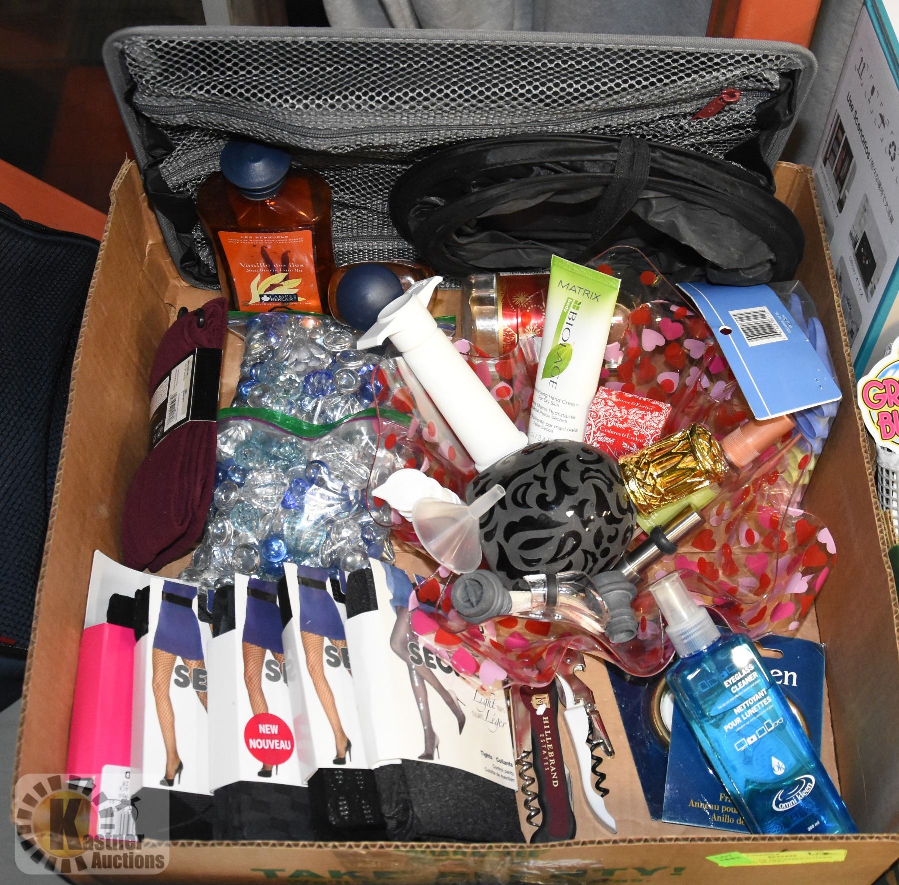 TIGHTS SIZES C-D, DECORATIVE BOWLS, WINE BOTTLE SUPPLIES, MOISTURIZING HAND CREAM, 2 BAGS OF SHINY DECORATIVE STONES, LAMP BERGER & OILS, COLLAPSIBLE GARBAGE CAN, JEWELLERY TRAVEL STORAGE & MORE