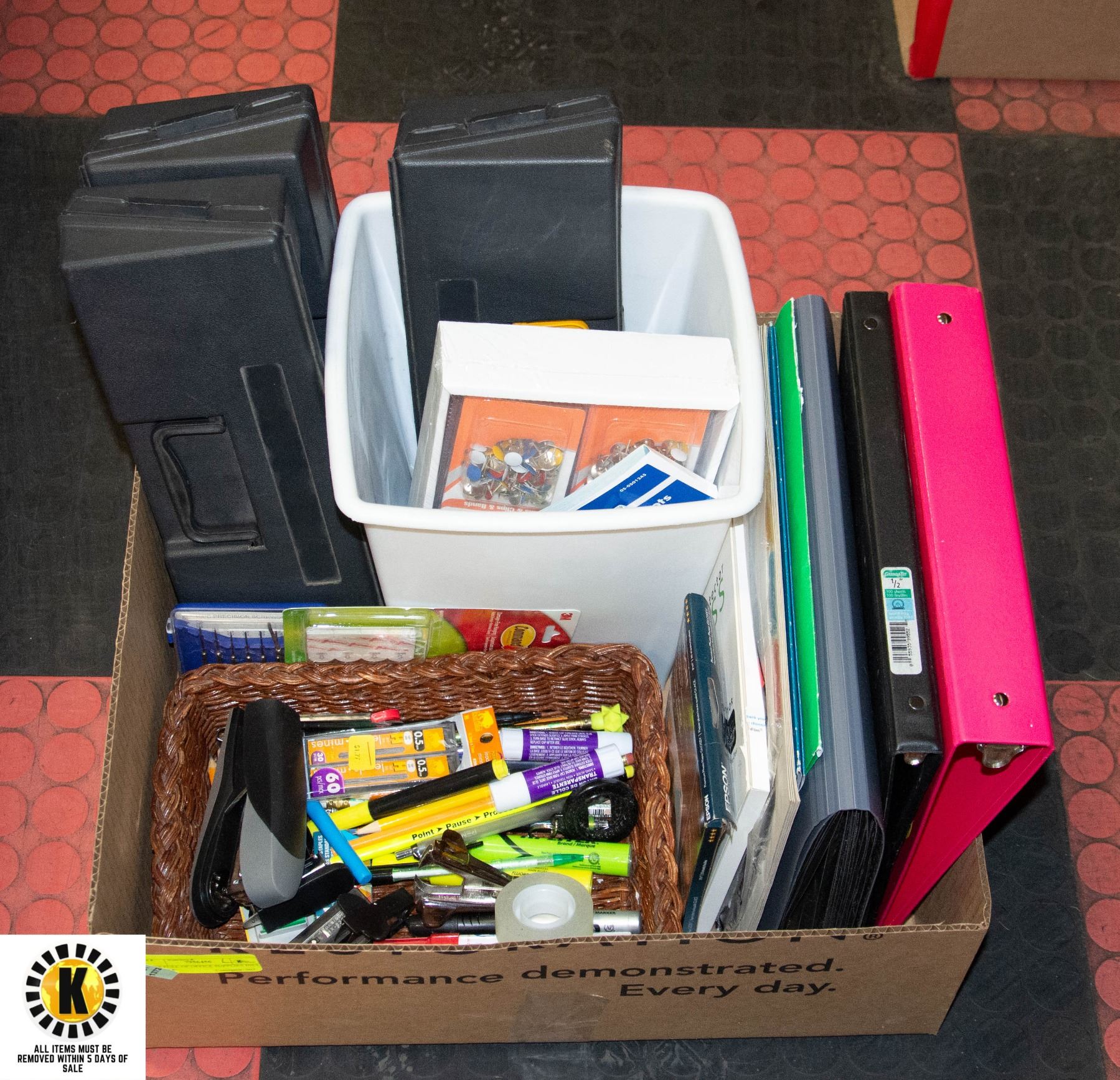 TOOL/OFFICE STORAGE ORGANIZERS, PHOTO PAPER, PAPER ORGANIZERS, GARBAGE CAN & MORE **ALL ITEMS MUST BE REMOVED BY 5PM SATURDAY, APRIL 22ND, 2023. ALL REMAINING ITEMS WILL BE SUBJECT TO A $6.00 PER DAY STORAGE CHARGE. ANY ITEMS REMAINING AFTER MONDAY, MAY 8TH, 2023 WILL BE CONSIDERED FORFEITED. NO REFUNDS WILL BE ISSUED FOR FORFEITED ITEMS.** TO SCHEDULE A PICK UP APPOINTMENT CLICK HERE
