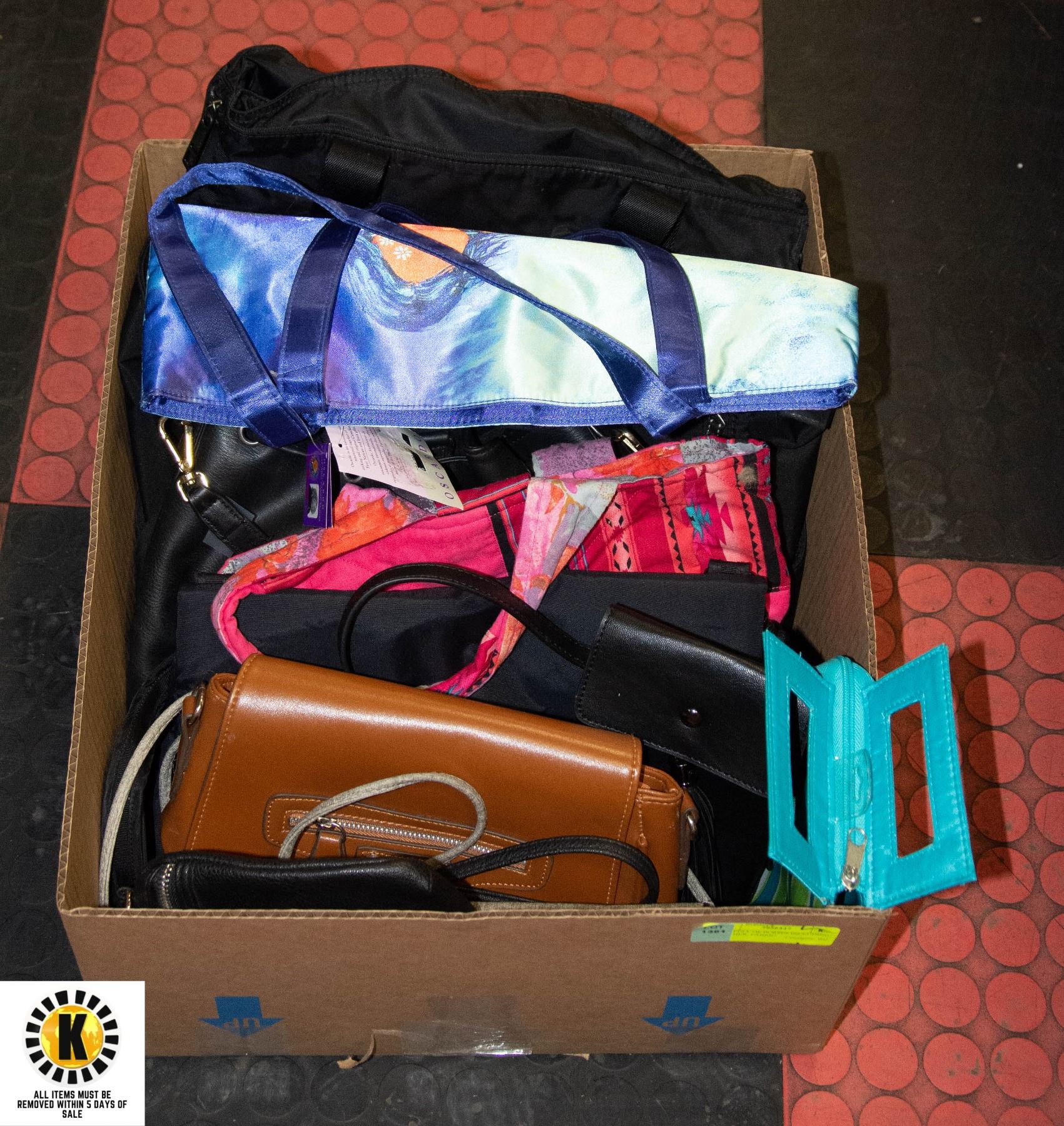 BOX FULL OF PURSES INCLUDING LEATHER, FABRIC,