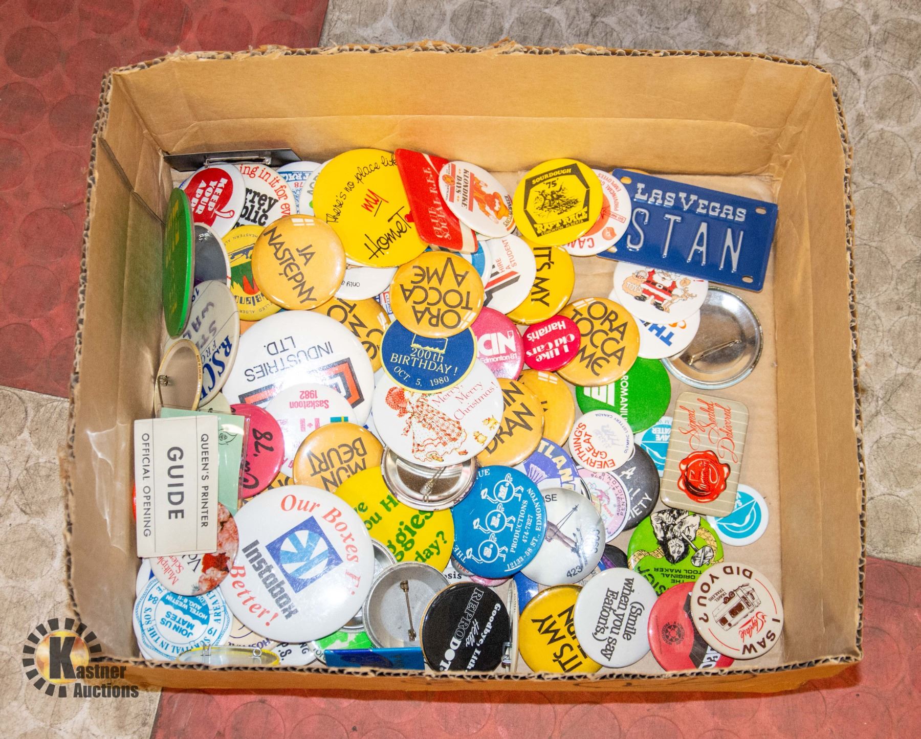 BOX FULL VINTAGE PIN BACK BUTTONS