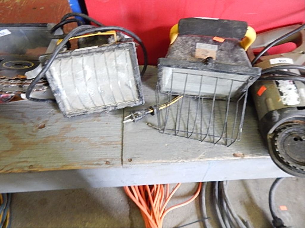 BOX - HALOGEN LIGHTS - 2, LARGE CAULKING GUN PORTER CABLE CLAW & BIN OF SAW BLADES