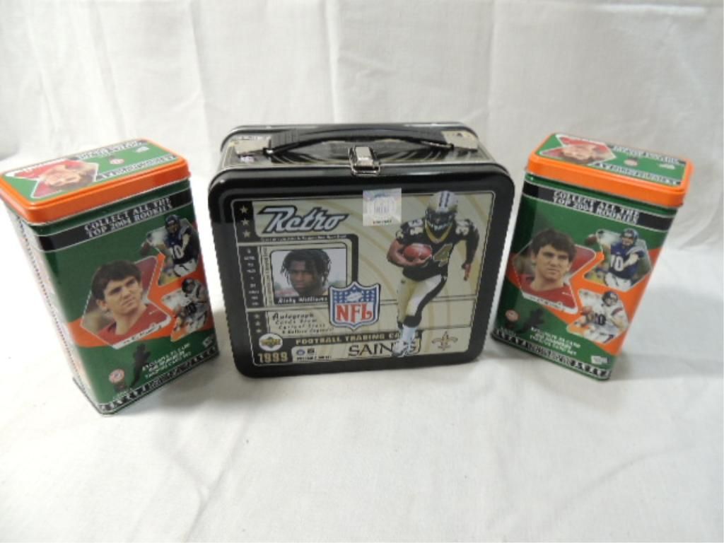 LOT OF 3 SPORTS TINS. LUNCHBOX, LUNCH BOX, AND MORE. AS SHOWN. SEE PICTURES FOR DETAILS.