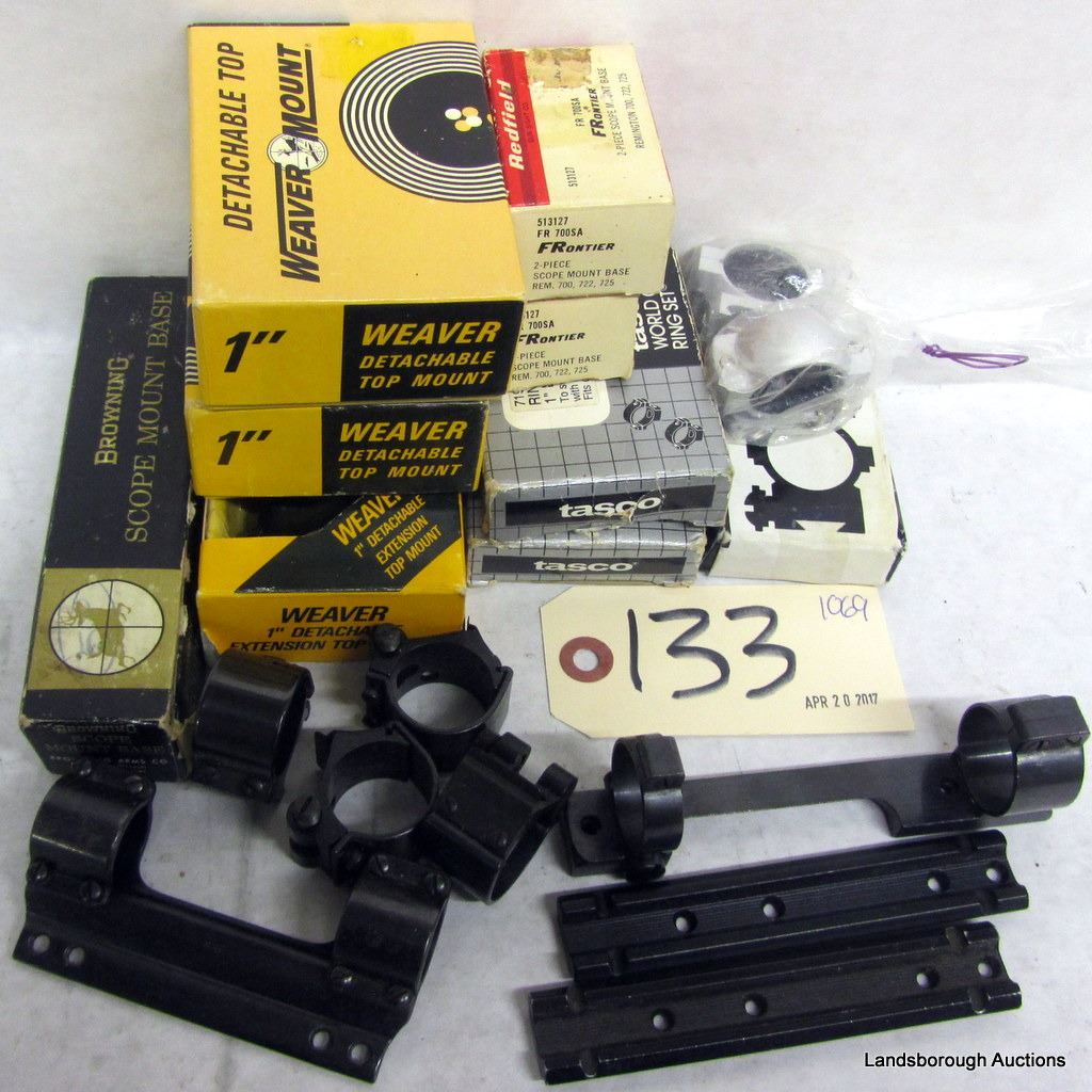 21 VARIOUS WEAVER SCOPE RINGS, FEW WITH MOUNTS, TWO LYMAN RINGS, FOUR BUSHNELL SCOPE MOUNT RINGS, ONE WEAVER DETACHABLE LONG SIDE MOUNT, ONE MOSSBERG FRONT SIGHT, ONE BROWNING SCOPE MOUNT BASE, TWO 2 PC REDFIELD SCOPE MOUNT BASES, FOUR TASCO RING SETS, FOUR UNKNOWN SCOPE RINGS, PLUS 4 UNKNOWN SCOPE BASES