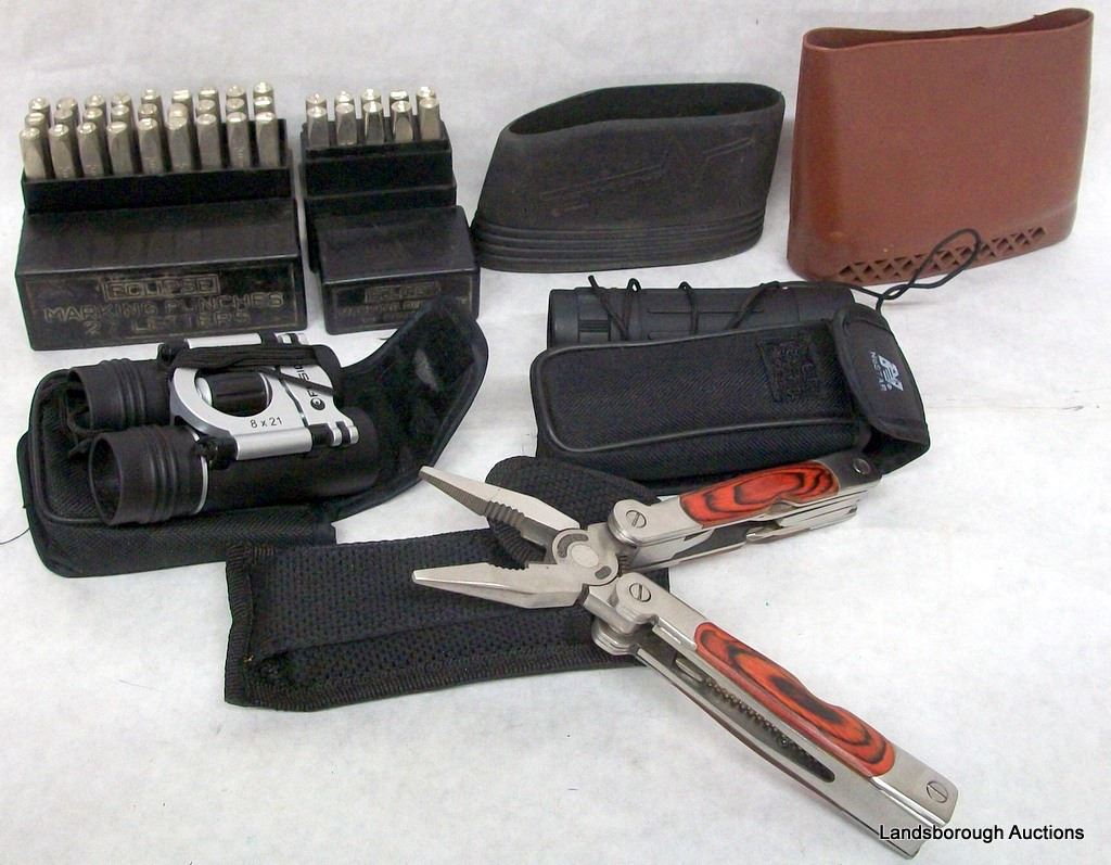MULTI TOOL, FUSION BINOCULARS, PUNCH SET NUMBERS AND ALPHABET, NC STAR MONOCULAR, TWO SLIP ON RECOIL PADS.