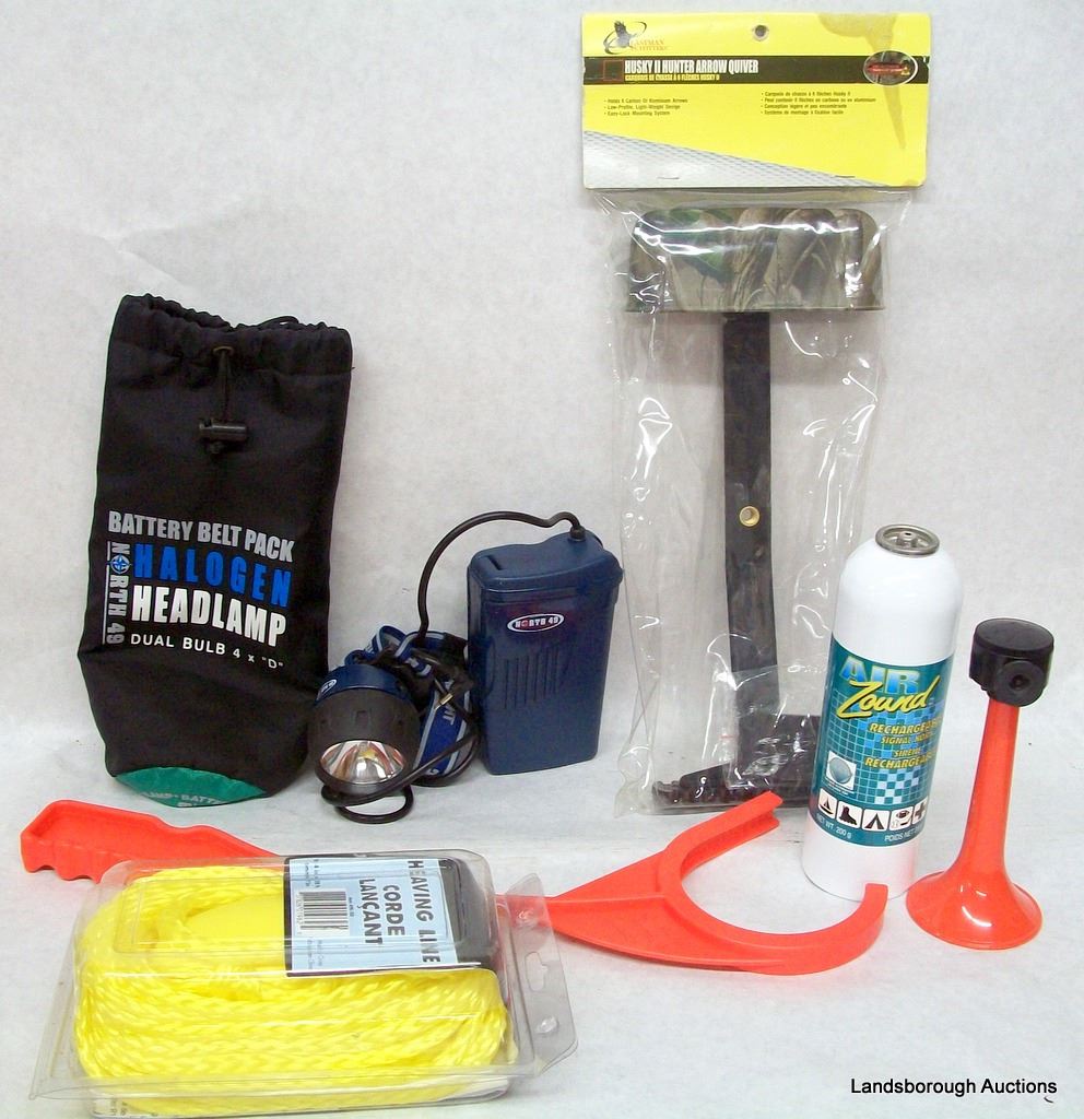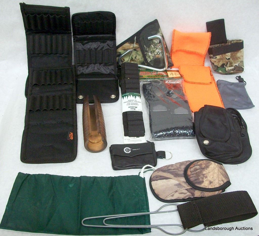 CLAY THROWER, SIX ARROW QUIVER, NORTH 49 HALOGEN HEADLAMP WITH BATTERY BELT PACK, 50 FT NYLON CORDAGE, RECHARGEABLE SIGNAL HORN, AMMO POUCHES, SUSPENDERS, SHOTGUN FOREARM, VARIETY OF EQUIPMENT POUCHES.