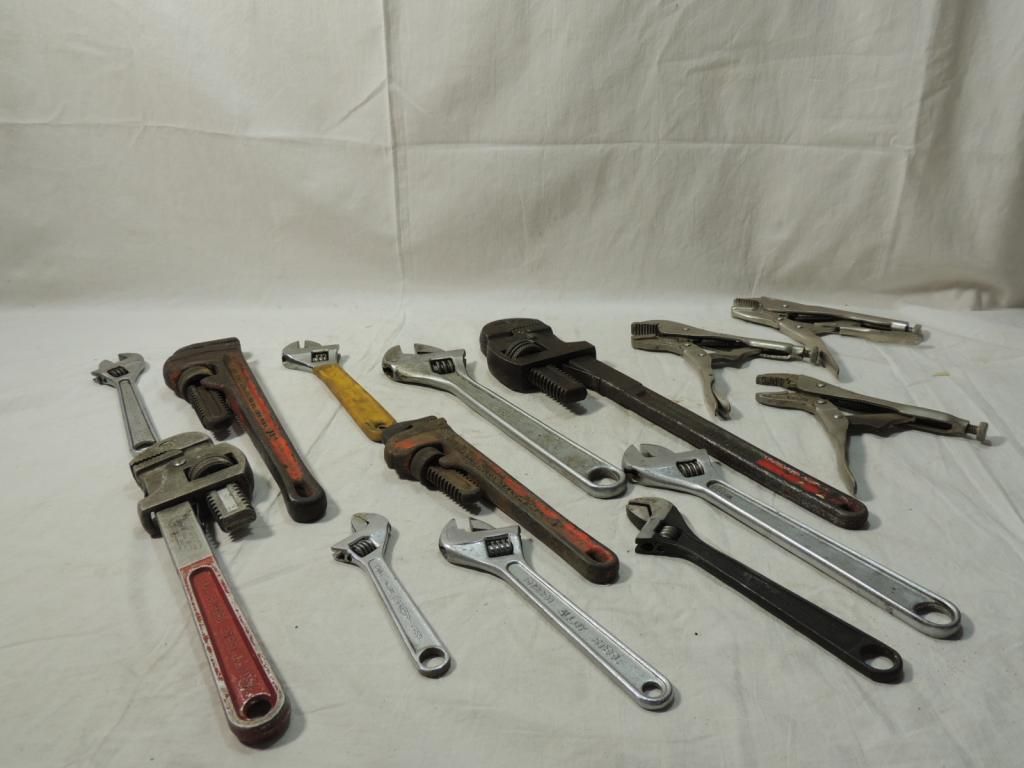 BOX LOT ADJUSTABLE WRENCHES AND PLIERS AS SHOWN. SEE PHOTO FOR MORE DETAILS.