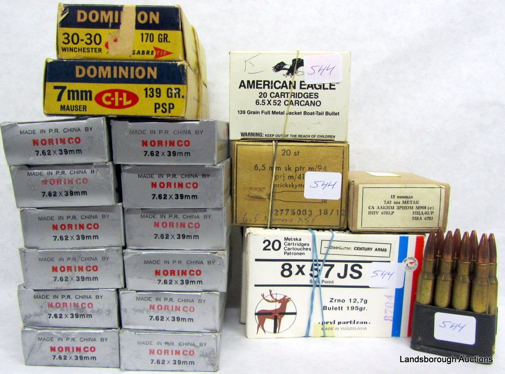 120 RNDS NORINCO 7.62 X 39; 11 RNDS 7MM MAUSER MILITARY; 15 RNDS 6.5 X 52 CARCANO MILITARY; 15 RNDS 7.62 X 54 MILITARY; 20 RNDS 6.5 X 55 SWEDISH MILITARY; 20 RNDS IMPERIAL 30-30 WIN; 40 RNDS PRVI 8 X 57JS; 8 RNDS 30-06 SPRG IN GARAND CLIP; 63 RNDS MISCELLANEOUS VINTAGE RIFLE AND PISTOL AMMO; 84 RNDS REMINGTON 12GA; 21 RNDS WINCHESTER 12GA; 15 RNDS MIXED SLUGS AND BUCK SHOT.