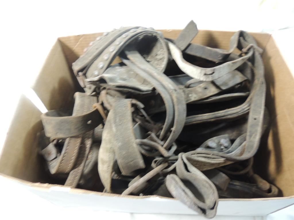ANTIQUE HORSE HARNESS, HARNESS PARTS, HORSE, VINTAGE, COLLECTIBLE LEATHER AS SHOWN SEE PHOTO FOR MORE DETAILS.