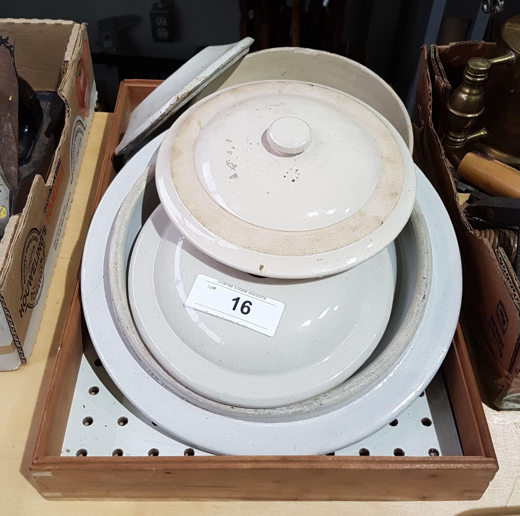 BOX LOT APPROX 6 CROCK/STONEWARE LIDS