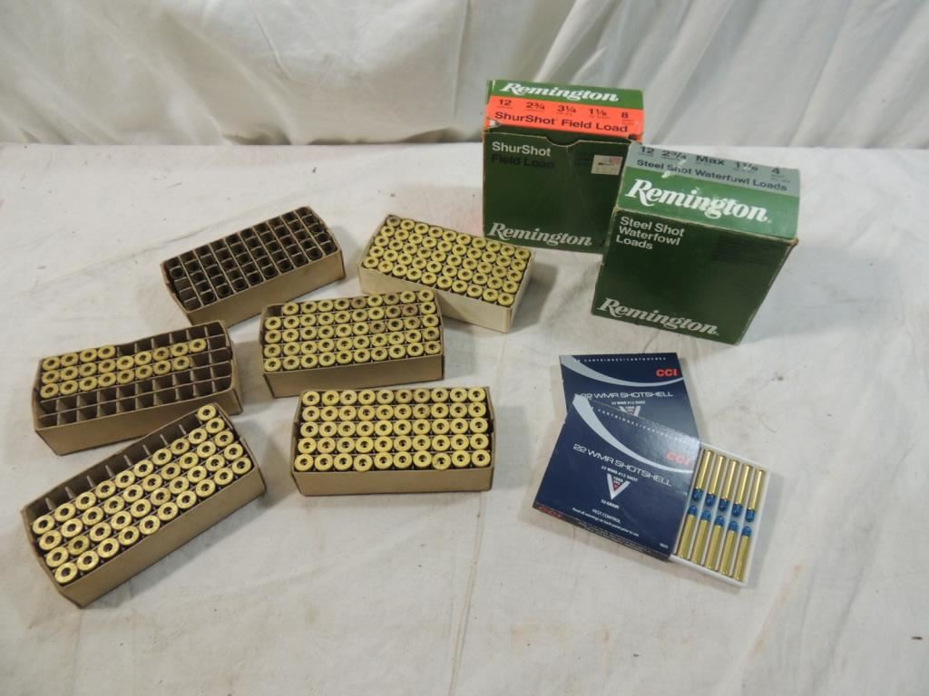 STEEL SHOT WATERFLOW LOADS, REMINGTON, SHURSHOT FIELD LOADER, 22 WMR SHOTSHELL 38 SPECIAL CASINGS, AS SHOWN SEE PHOTO FOR MORE DETAILS.