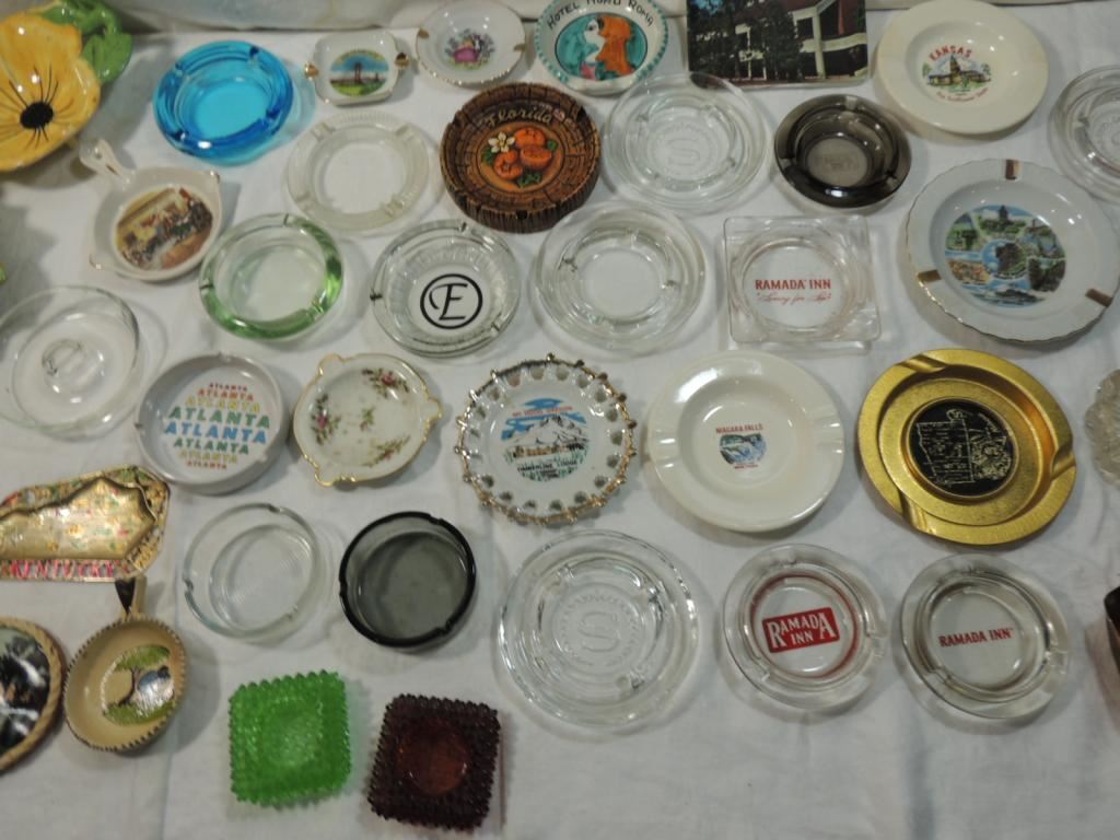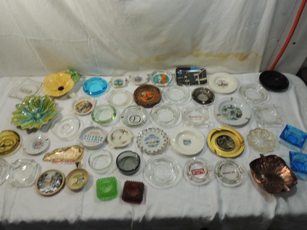 VINTAGE ASHTRAYS, DECORATIVE ASH TRAYS, DEPRESSION GLASS, CERAMIC,COLLECTIBLE, TOBACCIANA, GLASS, CLEAR GLASS, COLORED GLASS, TRAVEL, AS SHOWN SEE PHOTO FOR MORE DETAILS