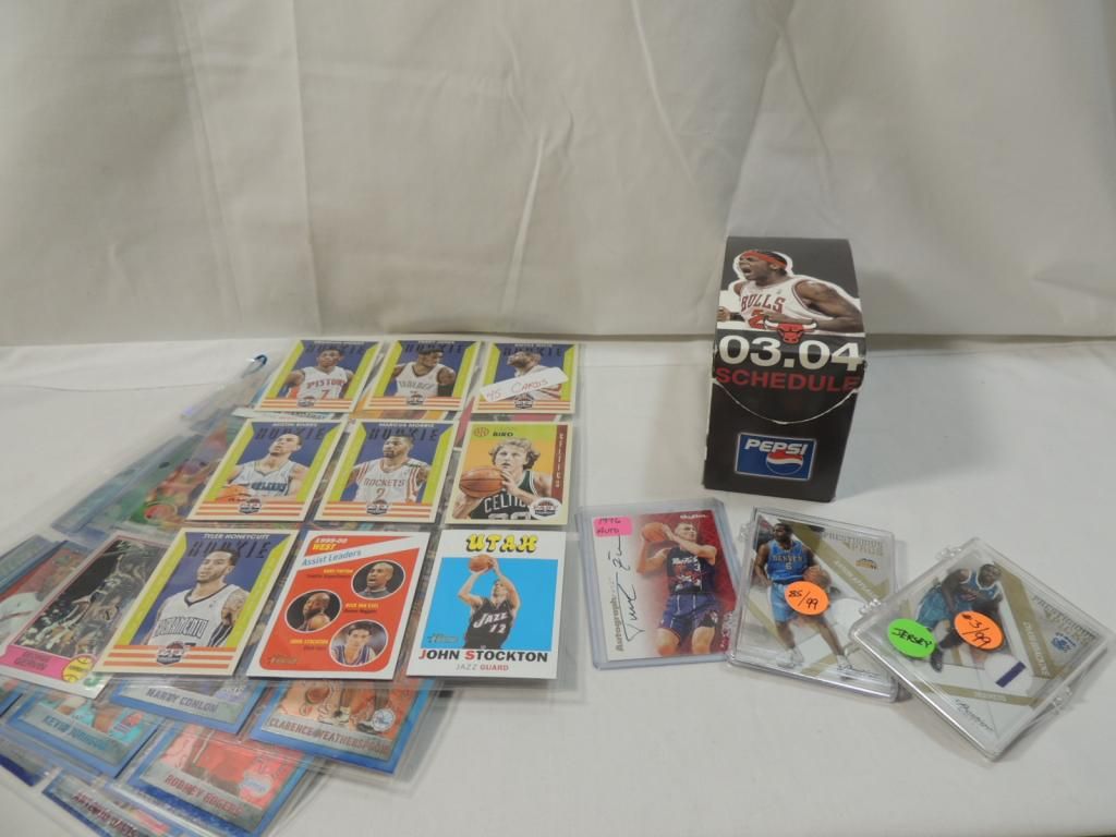 BASKETBALL JERSERY CARDS, AUTOGRAPH IAN JABAK CARD, 45 VINTAGE BASKETBALL CARDS IN BINDER SHEETS, 2003-04 CHICAGO BULLS SCHEDULES