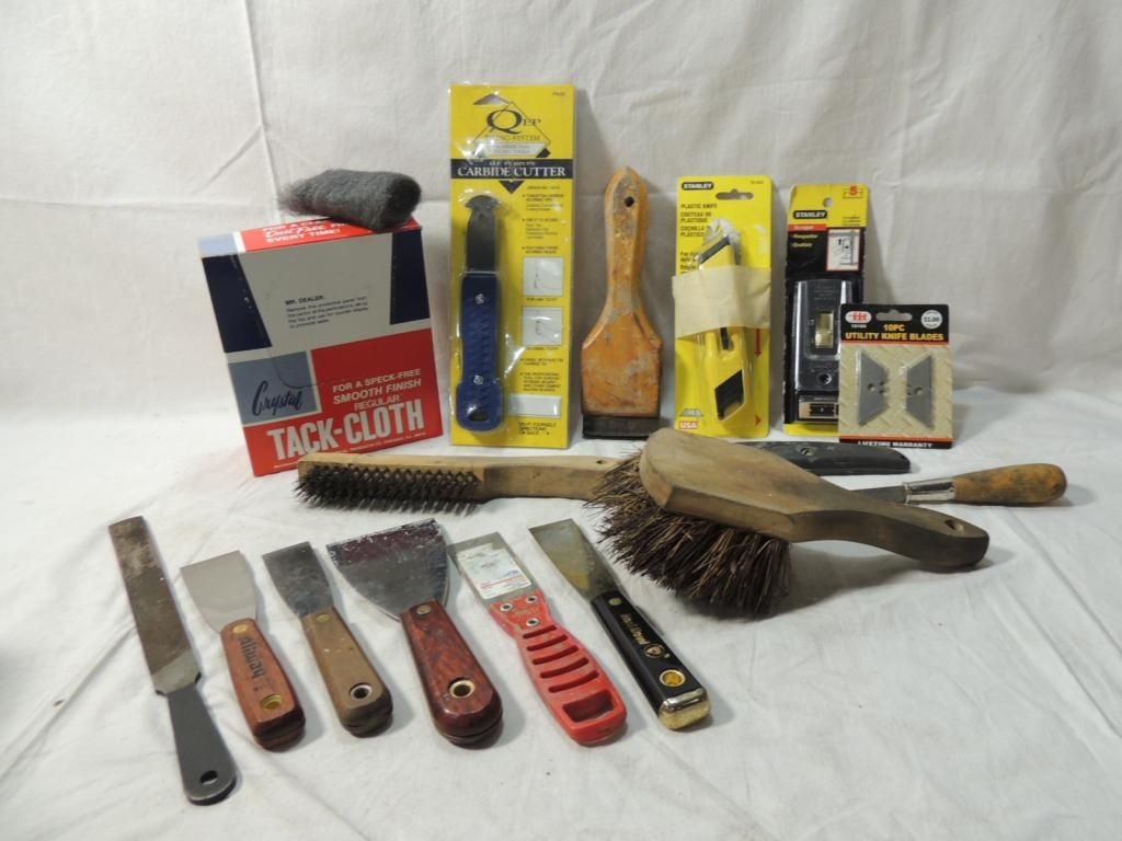 PUTTY KNIFE, CLOTH, BRUSHES, SCRAPPER, PLASTIC KNIFE, AS SHOWN. SEE PHOTO FOR MORE DETAILS.