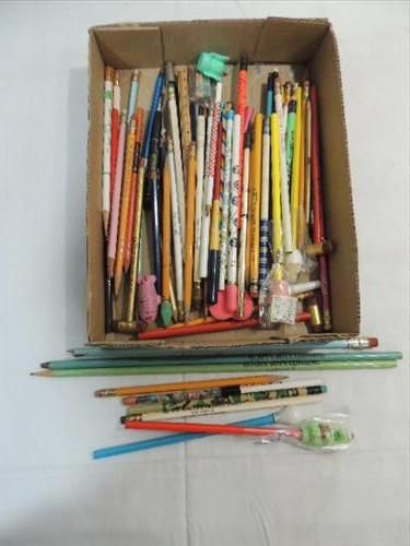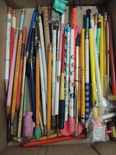BOX LOT ASSORTED BUSINESS ADVERTISEMENT PENCILS. ASSORTED STYLES & BUSINESSES. AS SHOWN. VIEW PICTURE FOR DETAIL.