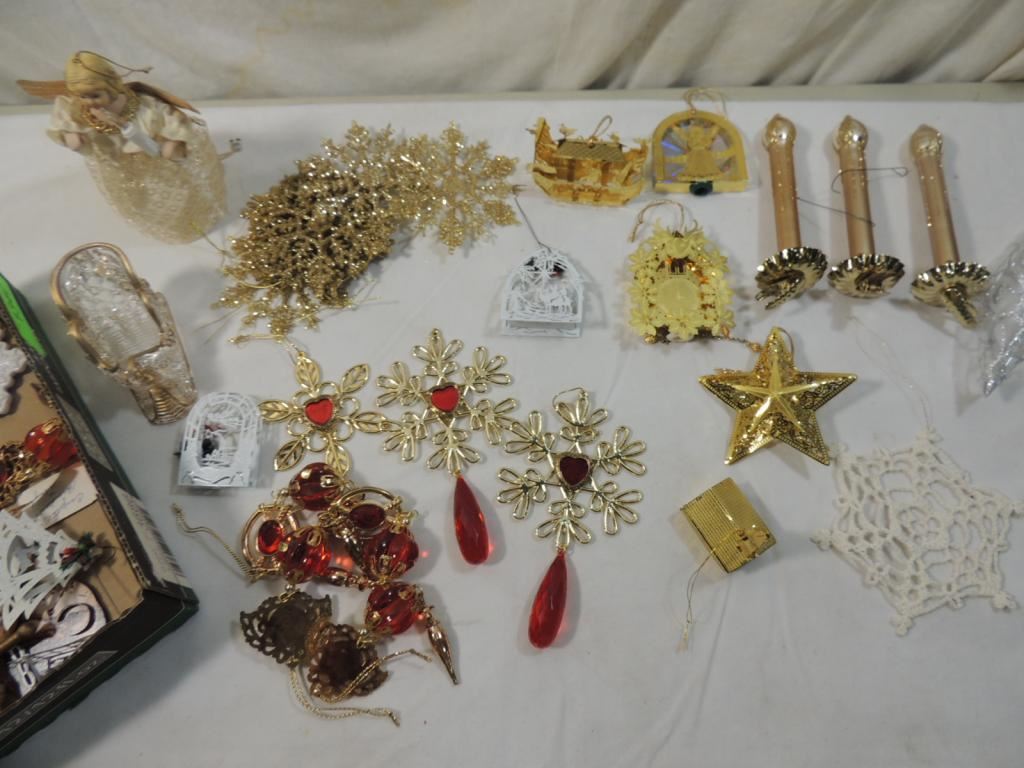 VINTAGE ORNAMENTS METAL DIECUT ORNAMENTS, GLASS ORNAMENTS, HOLIDAY, CHRISTMAS, TREE ORNAMENTS AS SHOWN SEE PHOTO FOR MORE DETAILS.
