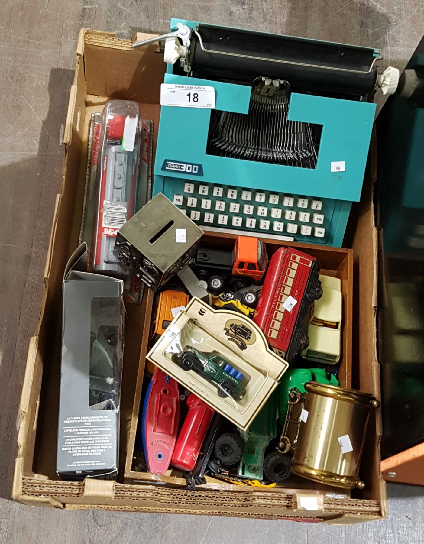 BOX LOT ASSORTED DIE CAST CARS, TYPEWRITER ETC