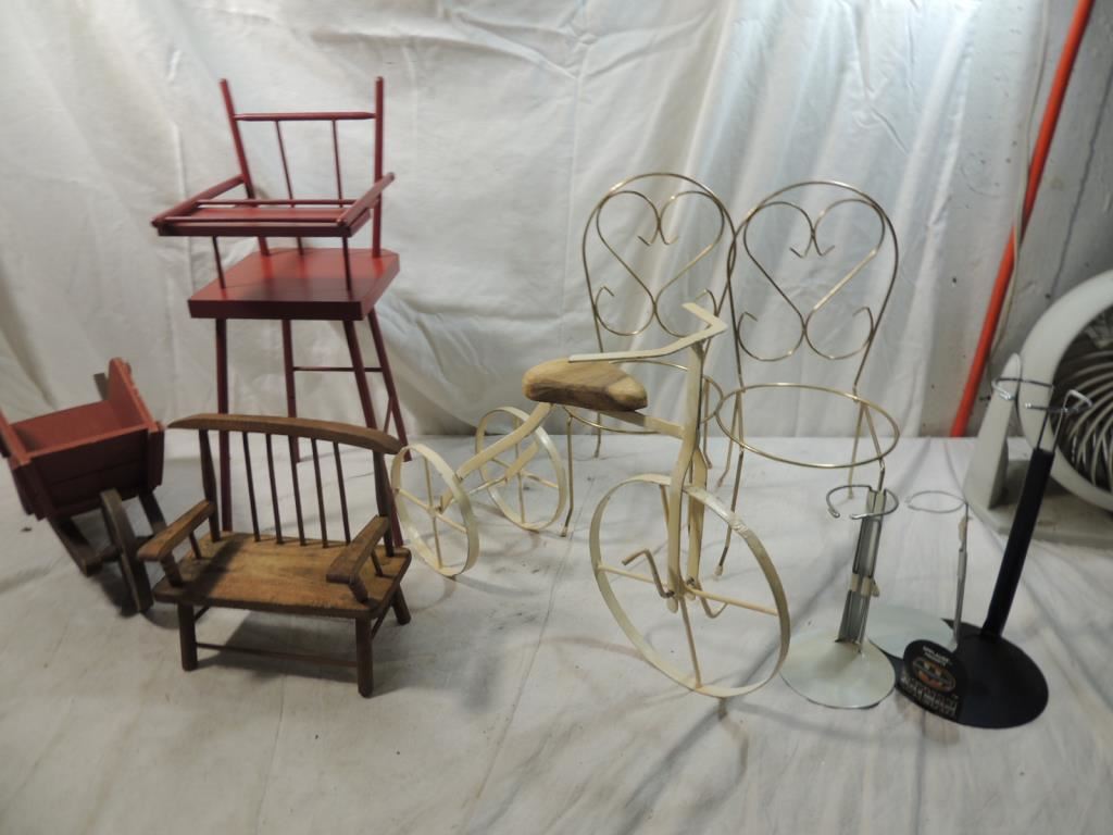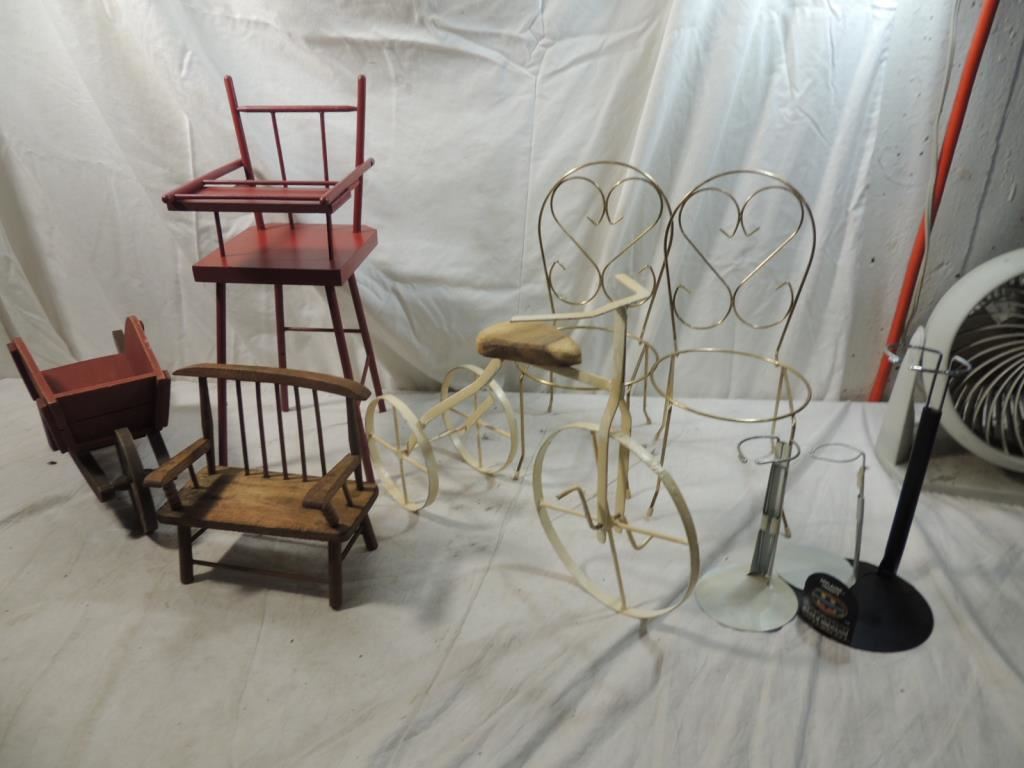 DOLL ACCESSORIES, DOLL FURNITURE, WHEEL BARROW, HIGH CHAIR, DOLL STANDS AS SHOWN SEE PHOTO FOR MORE DETAILS.