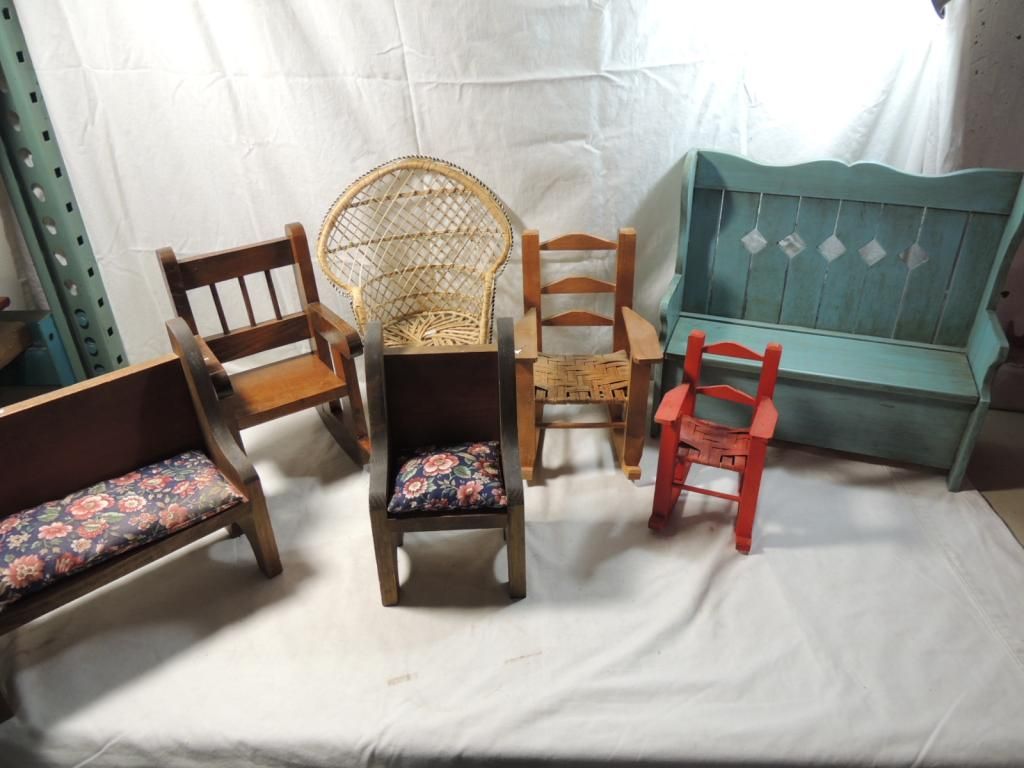 CHAIRS TABLES BENCHES ASSORTED DOLL FURNITURE. WICKER WOODEN HEART CUTOUT AS SHOWN SEE PHOTO FOR MORE DETAILS.