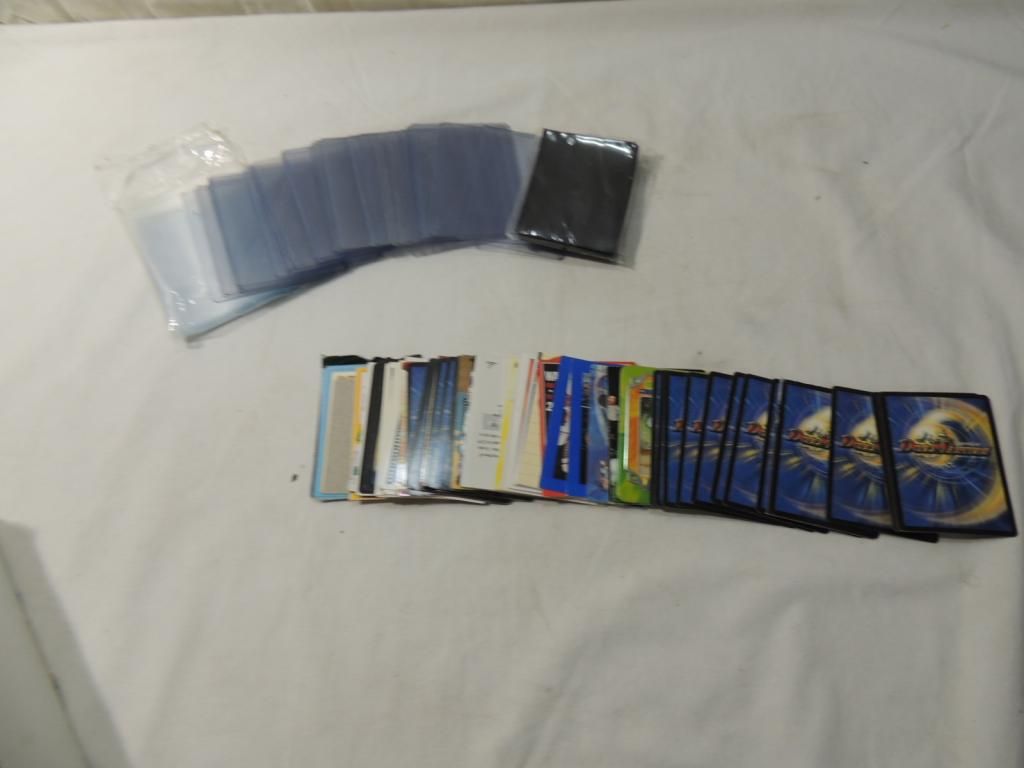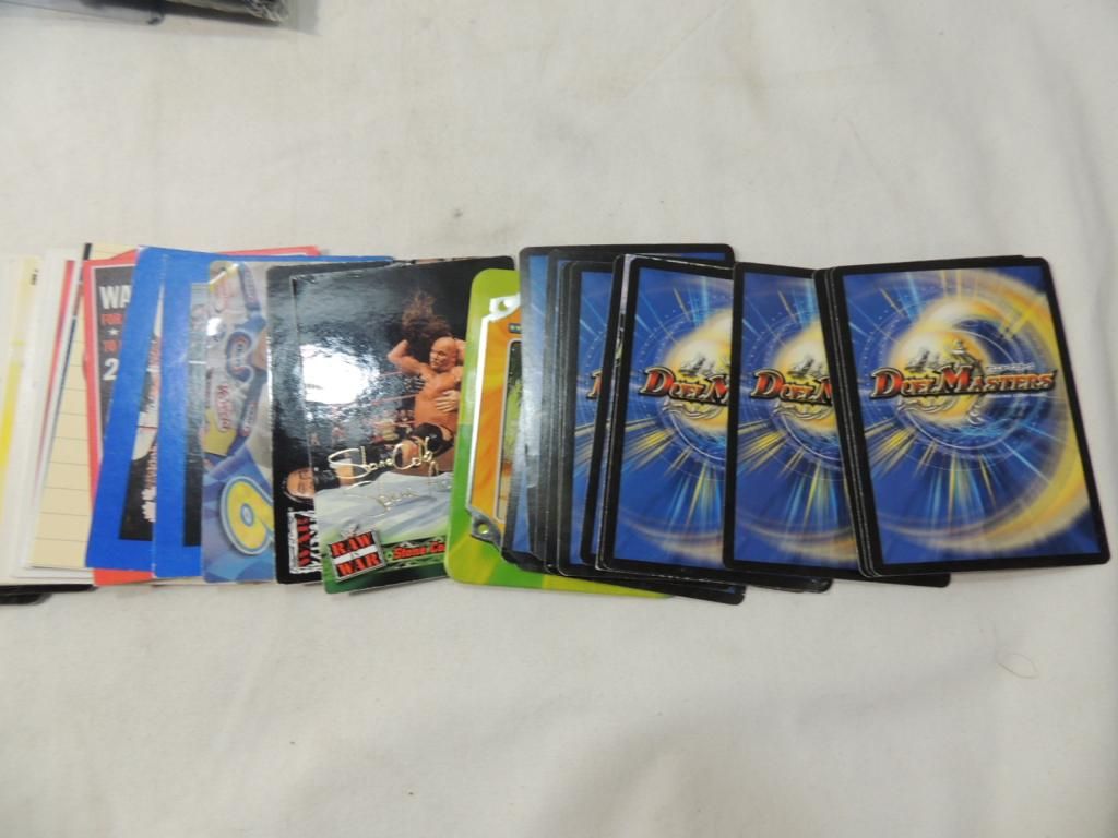 BOX LOT ASSORTED GAME TRADING CARDS WRESTLING TRADING CARDS AND CARD SLEEVES. AS SHOWN SEE PHOTO FOR MORE DETAILS.