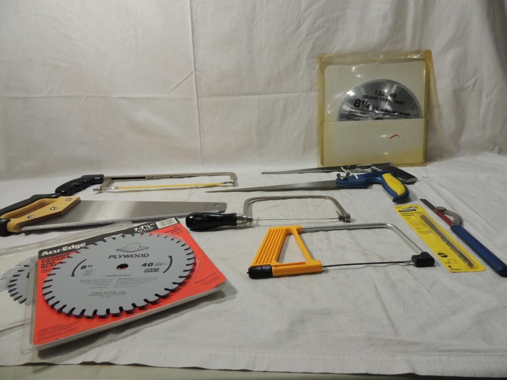 HAND SAW, HACK SAW AND SAW BLADES. ASSORTED. AS SHOWN SEE PHOTO FOR MORE DETAILS