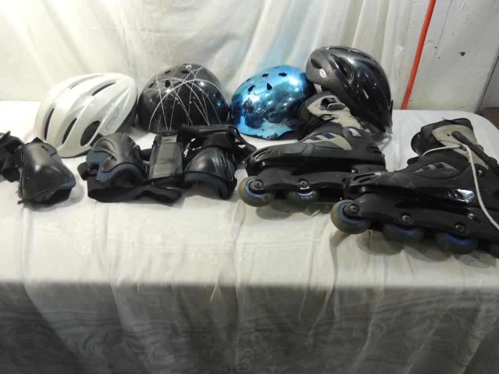 ASSORTED HELMETS, BIKE HELMETS, SKATING HELMETS, PADS, ROLLERBLADES, ROLLERSKATING AS SHOWN SEE PHOTO FOR MORE DETAILS.