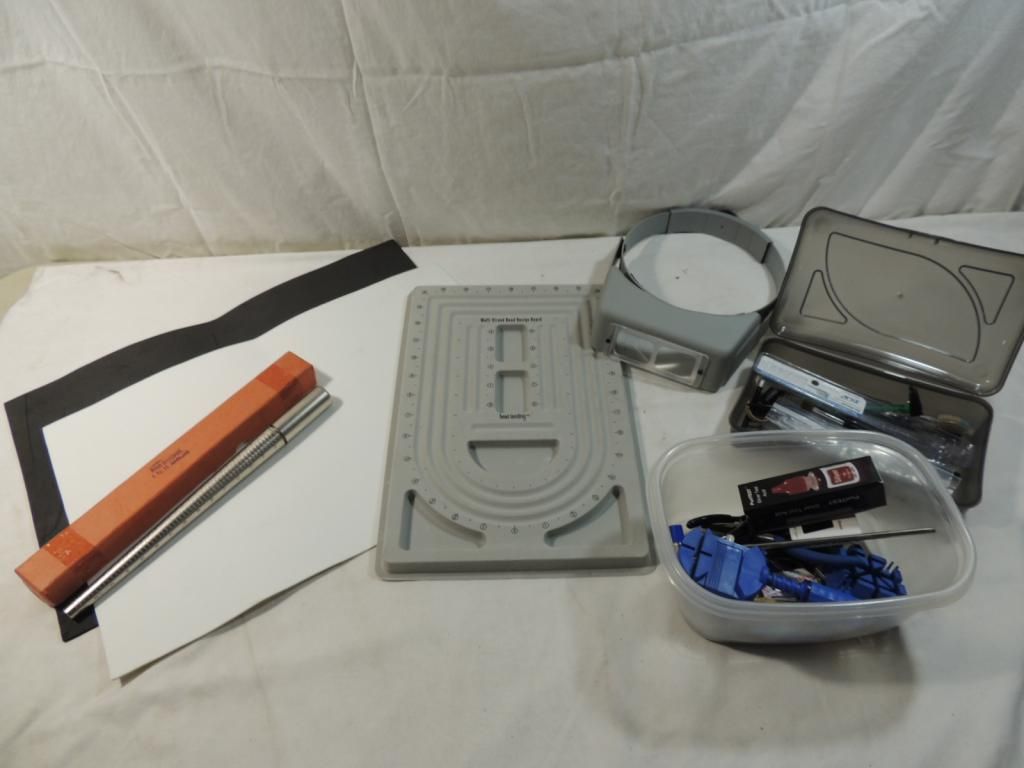 NECKLACE SIZER, RING SIZER, MAGNIFYING VISOR, NEEDLE NOSE PLIERS, SILVER TEST ACID, CLEANING TOOLS AS SHOWN SEE PHOTO FOR MORE DETAILS.