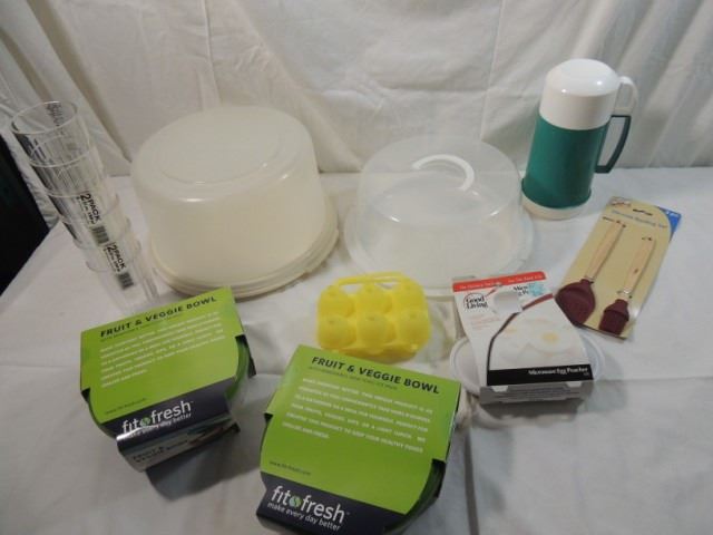 CAKE HOLDER, GLASSES, JELLO MOLDS, STORAGE, ICE PACE FRUIT AND BEGGIE BOWL, UTENCILS, THERMOS, MICROWAVE EGG POACHER, NEW KITCHEN ITEMS AS SHOWN SEE PHOTO FOR MORE DETAILS