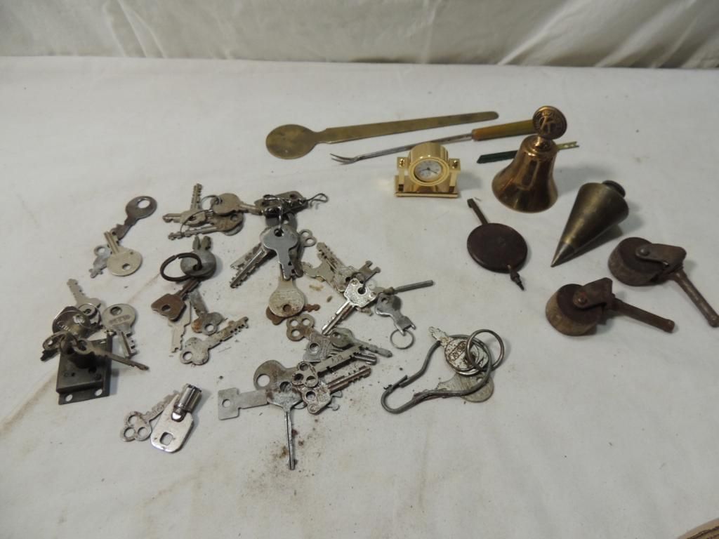 WHEELS ASSORTED MIXED KEYS, BELL LETTER OPENER FONDUE FORK CLOCK. AS SHOWN SEE PHOTO FOR MORE DETAILS .