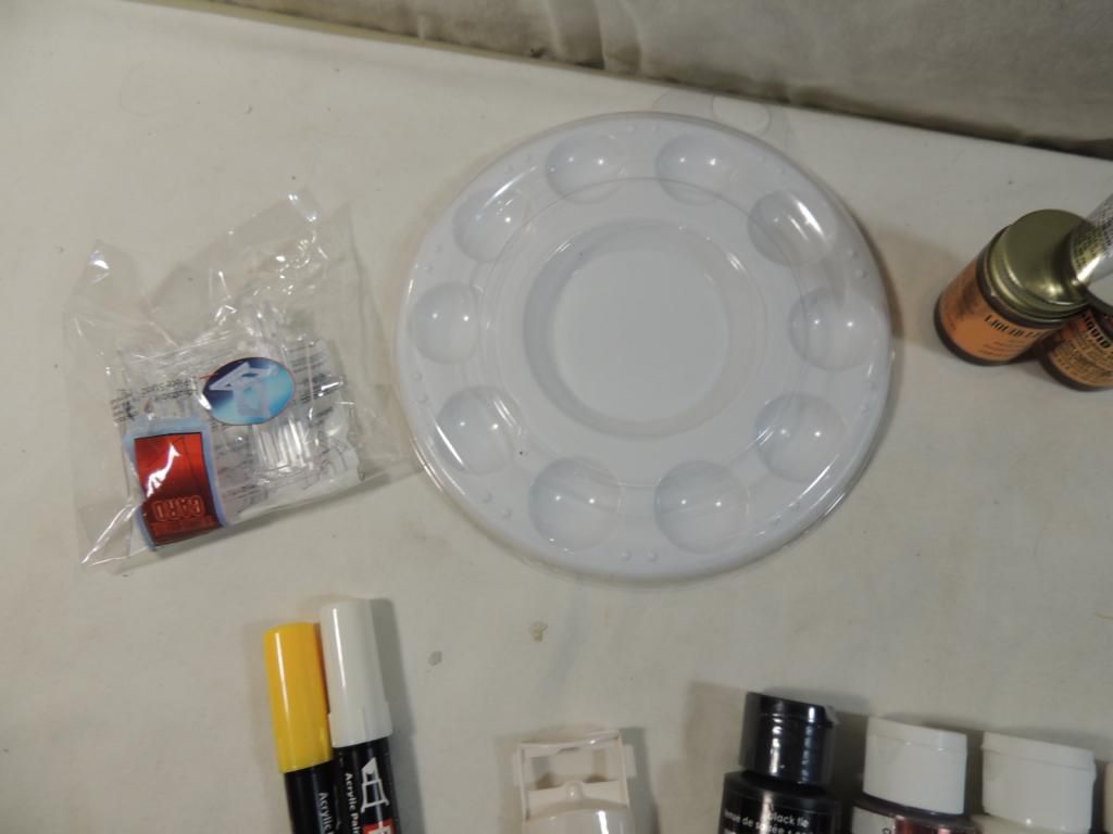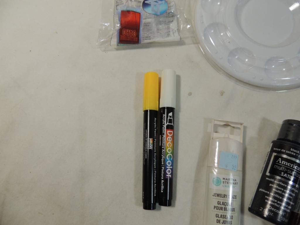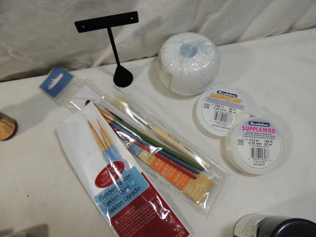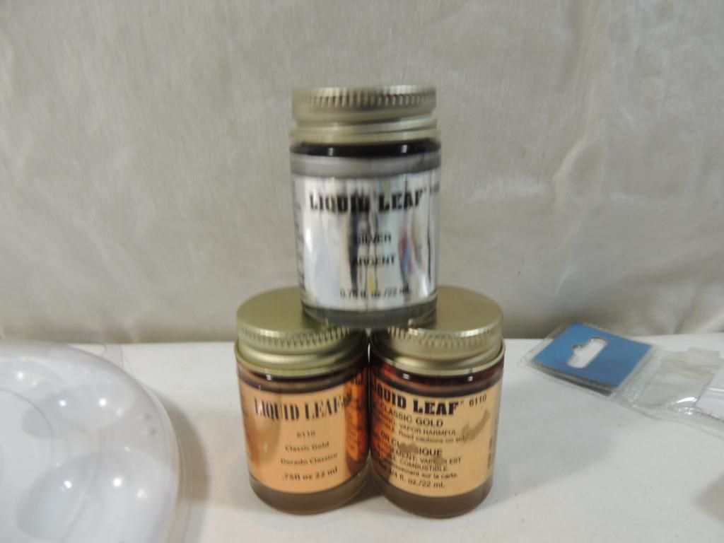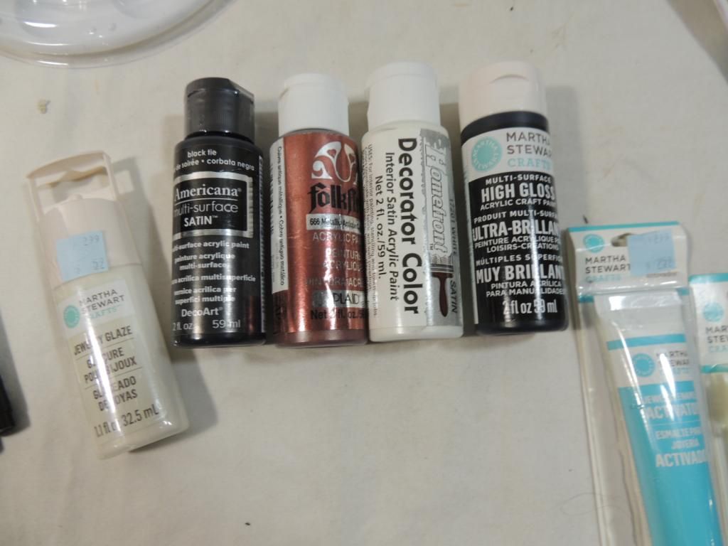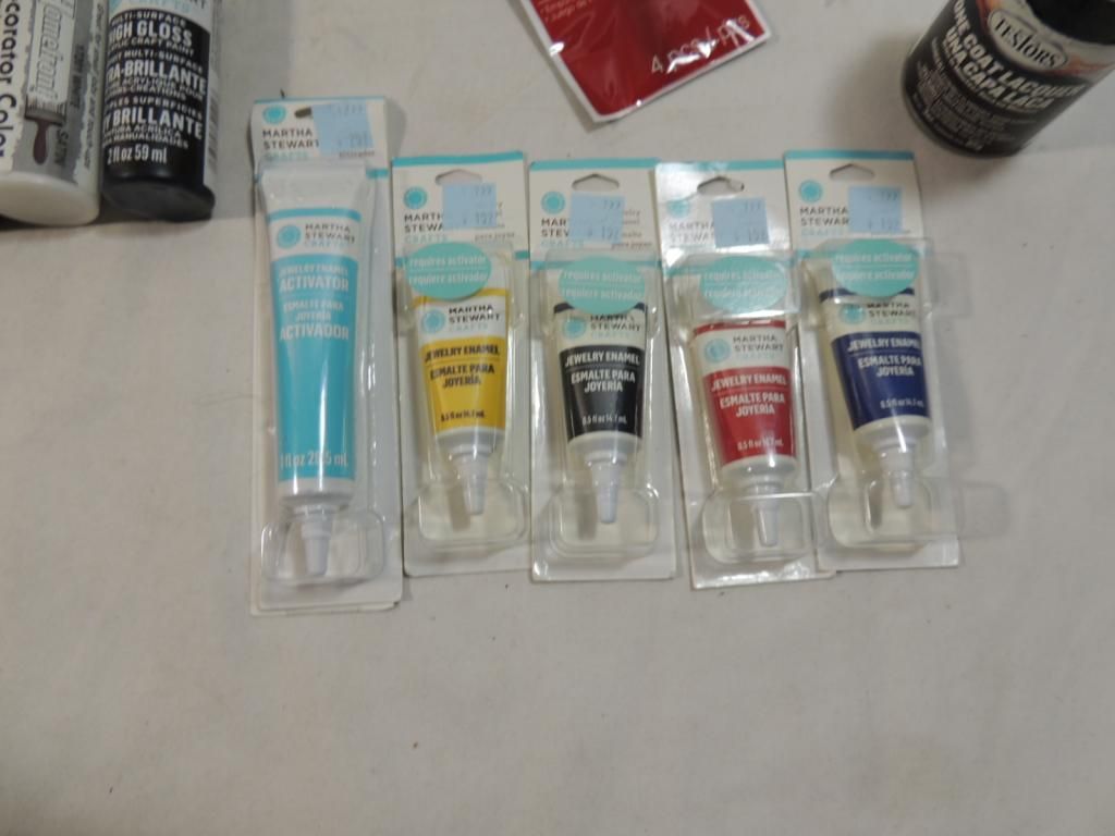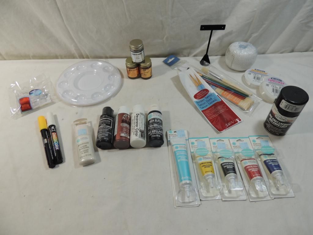 BOX LOT ASSORTED PAINTS MARTHA STEWART ACRYLIC GRAFT PAINT, PAINT BRUSHES, NEW JEWELRY ENAMEL, LIQUID LEAF GOLD, LIQUID LEAF SILVER, DANDYLINE, STRING, PAINT TRAY, ONE COAT LACQUER AS SHOWN SEE PHOTO FOR MORE DETAILS.