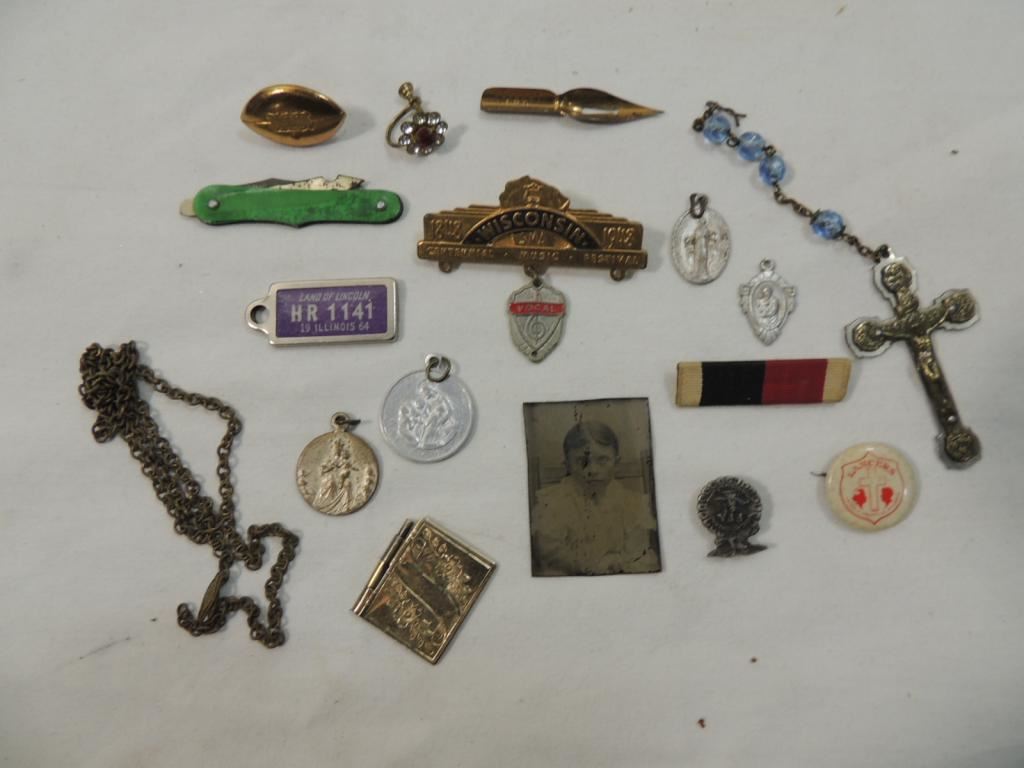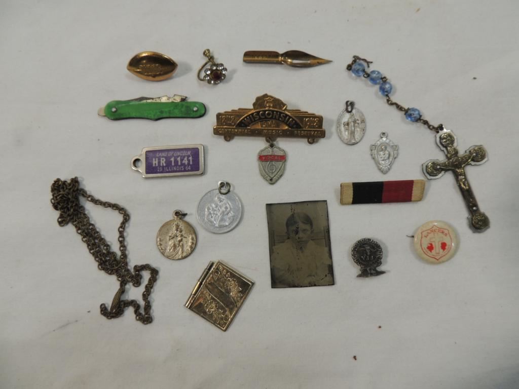 ASSORTED PENDENTS, PINS, LOCKET, ASSORTED VINTAGE METALS, BUTTONS, LOCKET, AS SHOWN SEE PHOTO FOR MORE DETIALS.