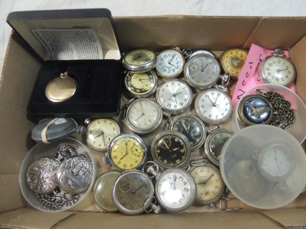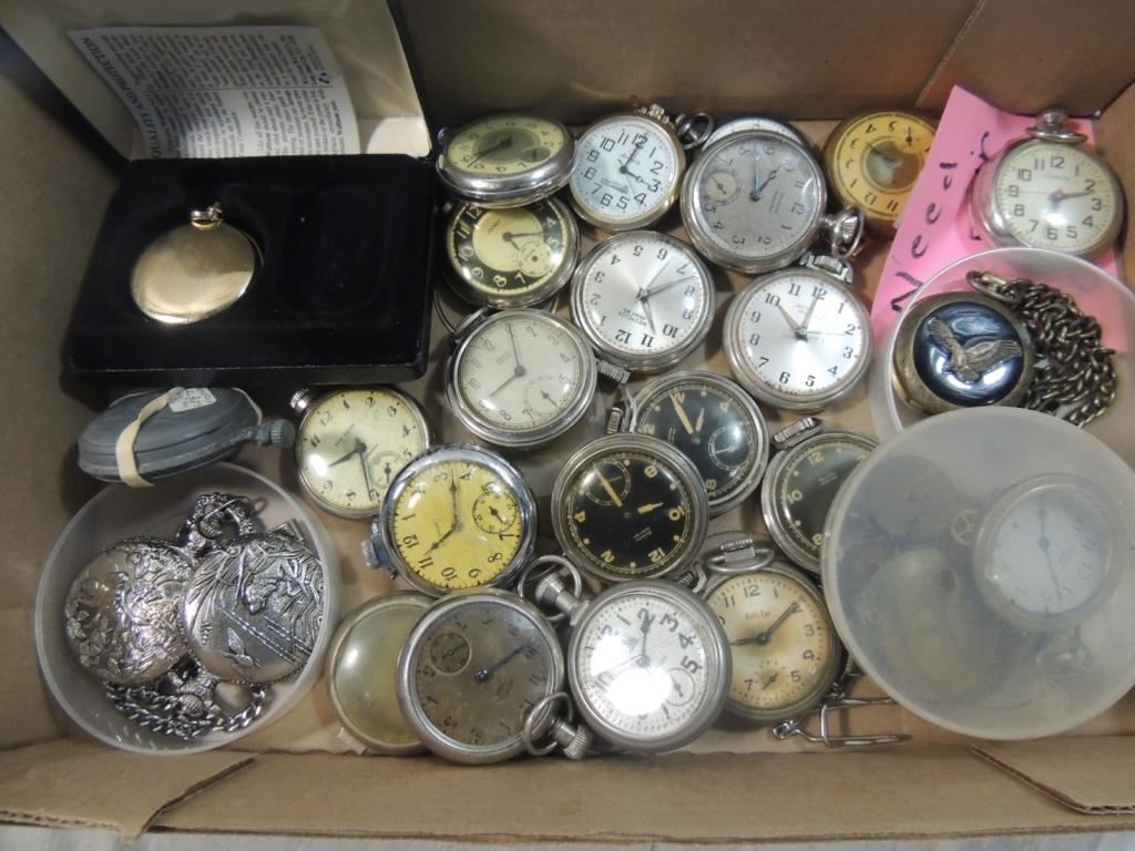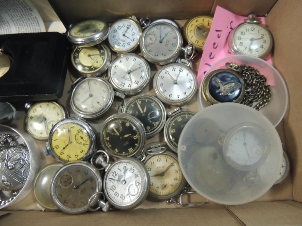 NEEDS REPAIR, ASSORTED POCKET WATCHES, VINTAGE WATCHES, COLLECTIBLE, SILVERTONE, ANTIQUE WATCHES, POCKET WATCHES AS SHOWN SEE PHOTO FOR MORE DETAILS.