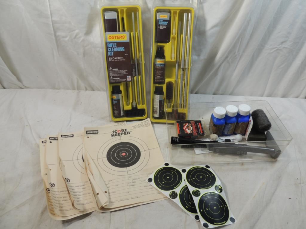 TARGETS, OUTERS, RIFLE CLEANING KIT 22 CALIBER, CROSMAN COPPER HEAD BBS, GLENFIELD 4X15 SCOPE, RUST REMOVER, GUN ACCESSORIES, AS SHOWN SEE PHOTO FOR MORE DETAILS.