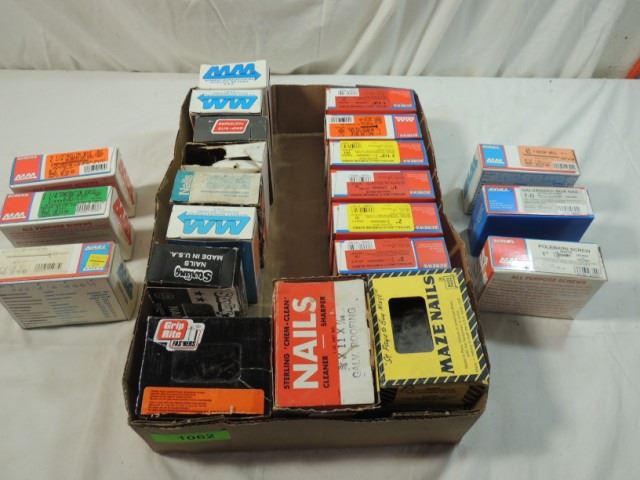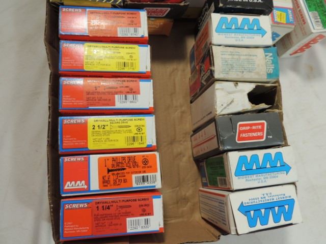 SCREWS & NAILS, IN BOXES, VARIOUS, NAILS, AS SHOWN SEE PHOTO FOR MORE DETAILS.