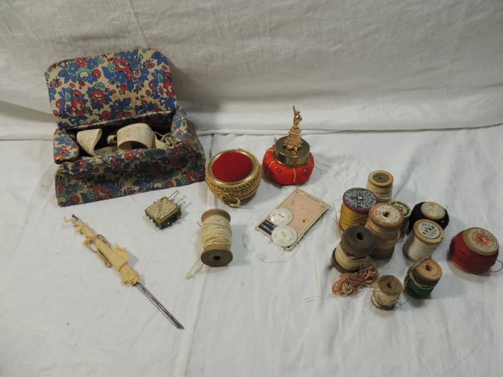PIN CUSHION, THREAD, SPOOLS, YARN, LINING, VINTAGE AS SHOWN SEE PHOTO FOR MORE DETIALS.