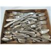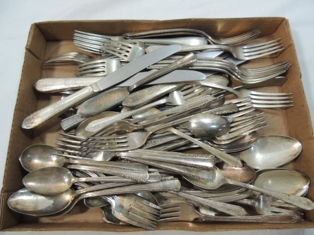SILVERPLATED FLATWARE, SILVERWARE, VINTAGE SILVERPLATED COLLECTIBLE, VINTAGE FLATWARE, BOX LOT, AS SHOWN SEE PHOTO FOR MORE DETAILS.