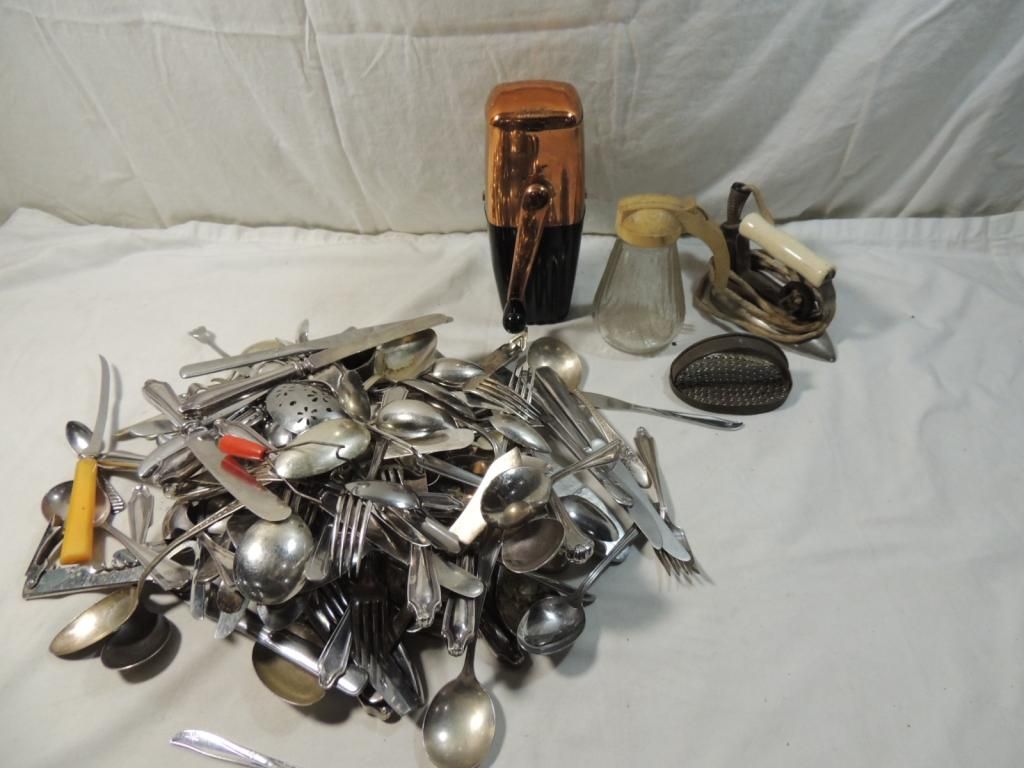 VINTAGE IRON, ICE CRUSHER, SYRUP, CHEESE GRADER, ASSORTED SILVERWARE. AS SHOWN SEE PHOTO FOR MORE DETAILS.