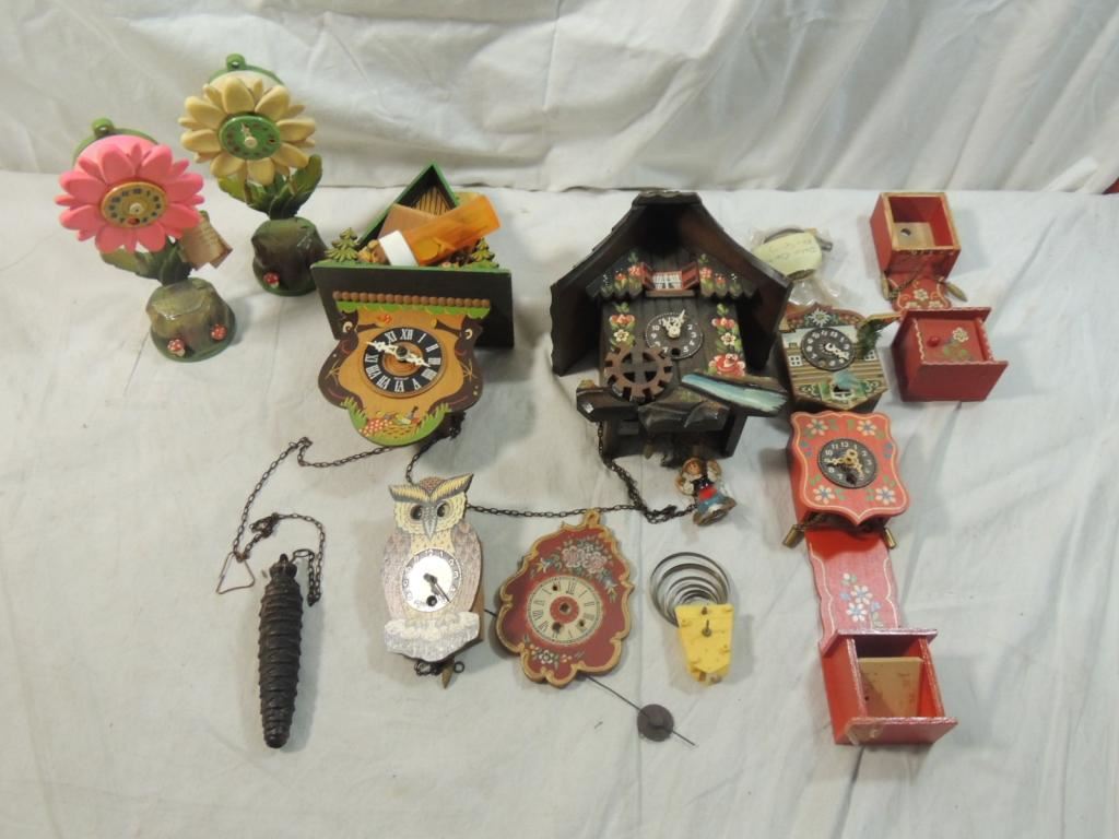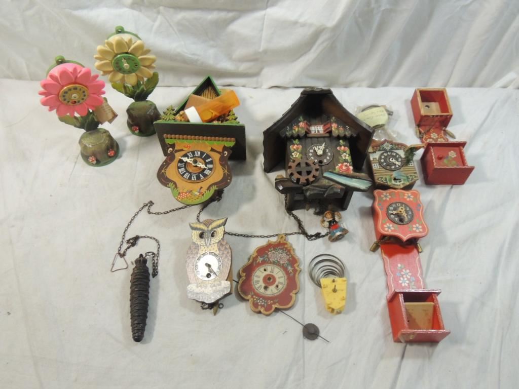 ASSORTED CUCKOO CLOCK PARTS, SMALL CUCKOO CLOCK PARTS ANTIQUE CUCKOO CLOCK, VINTAGE CUCKOO CLOCK, DECORATIVE CLOCKS, CLOCK REPAIR, PARTS INCLUDED, WOODEN CLOCK, GERMAN CLOCK, REPAIR, AS SHOWN SEE PHOTO FOR MORE DETAILS