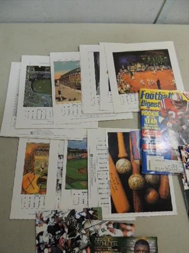 BOX LOT ASSORTED SPORTS COLLECTIBLES: MAGAZINES, OVERSIZED SPORTS CARDS, 1996 & 97 SPORTS ART CALENDER. AS SHOWN. VIEW PICTURE FOR DETAIL.