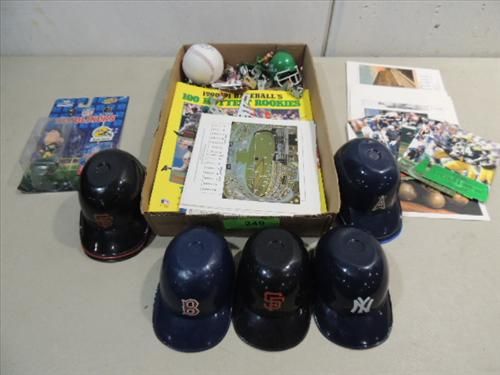 BOX LOT ASSORTED SPORTS COLLECTIBLES: MAGAZINES, OVERSIZED SPORTS CARDS, 1996 & 97 SPORTS ART CALENDER, MINI BASEBALL HELMETS, FOOTBALL PLAYERS FOR THE FIBRATING BOARD GAME AND MUCH MORE. AS SHOWN. VIEW PICTURE FOR DETAIL.